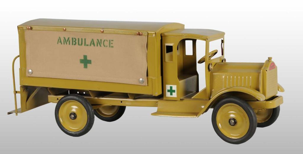 Description Circa 1928. Packard enclosed cab with rear service body and canvas curtains. Older restoration. Condition (Restored). Size 27" L.