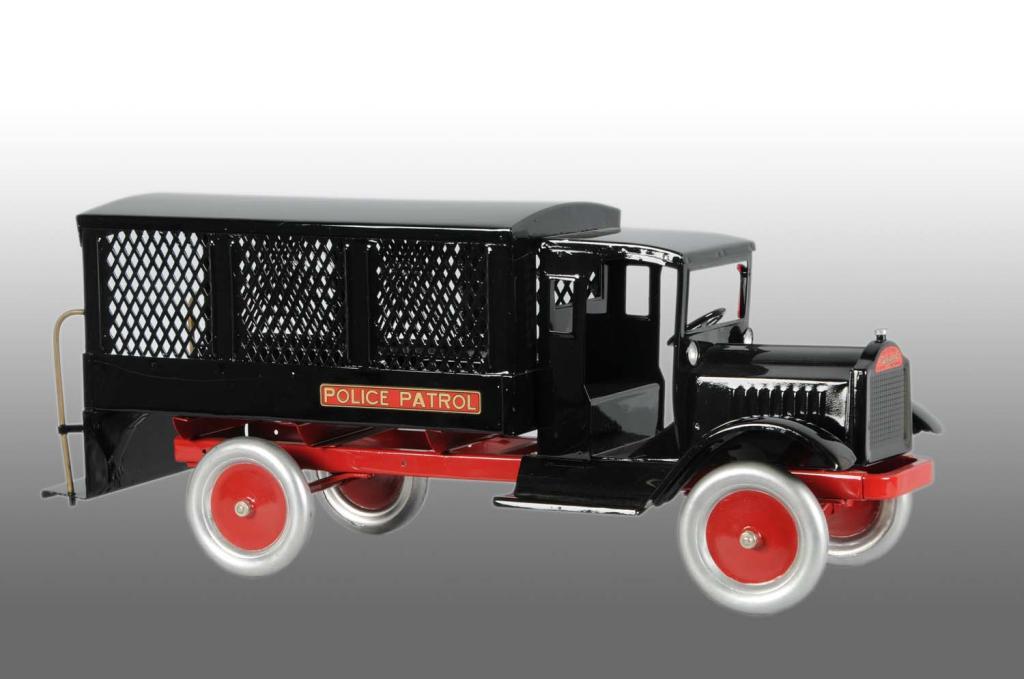 Early version. Packard closed cab with a three screen enclosed rear body and rear step. Complete professional restoration to an all original toy. Condition (Restored). Size 27" L.
