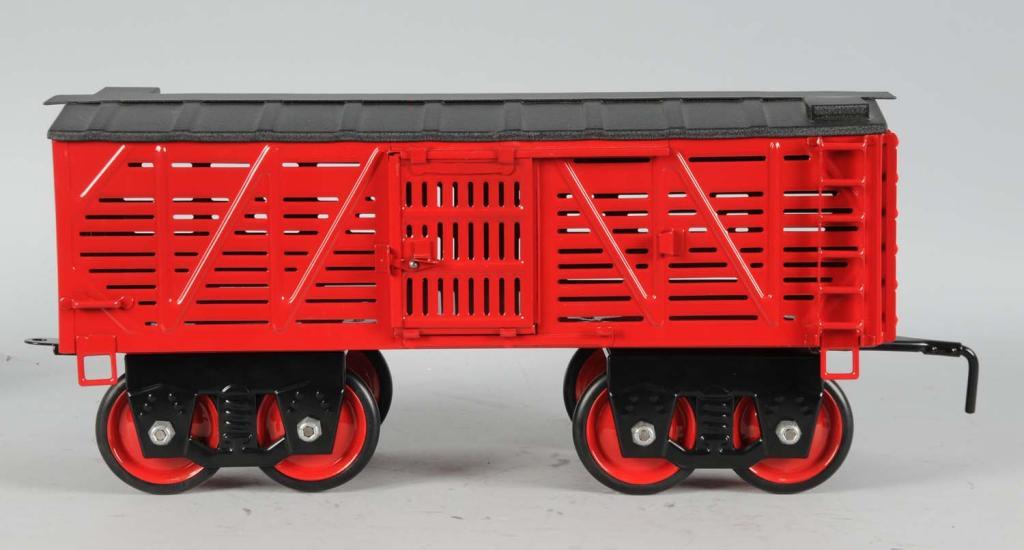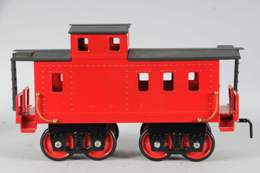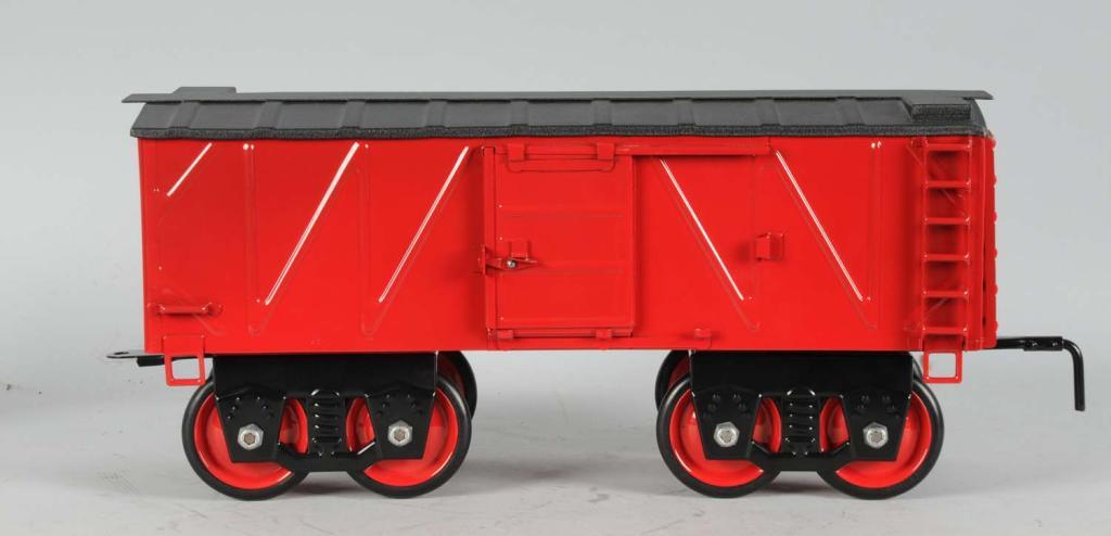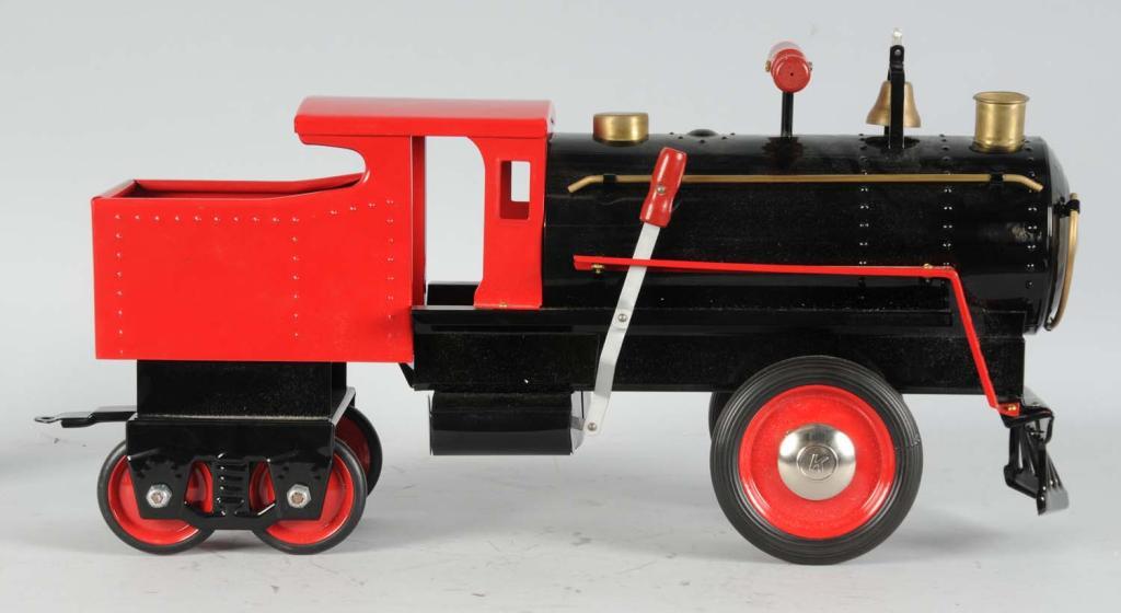 Includes four pieces. Engine is all original but professionally restored and three train cars are reproductions by Greg Robson of California. These sets were produced to be compatible with the Keystone engine. Condition (Restored).
