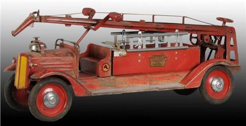 Description American. Circa 1935. Open front cab with electric headlights, steering handle. Rear body includes pump-operated water reservoir. Missing original seat with replacement side ladders. Condition (Very Good). Size 32" L.
