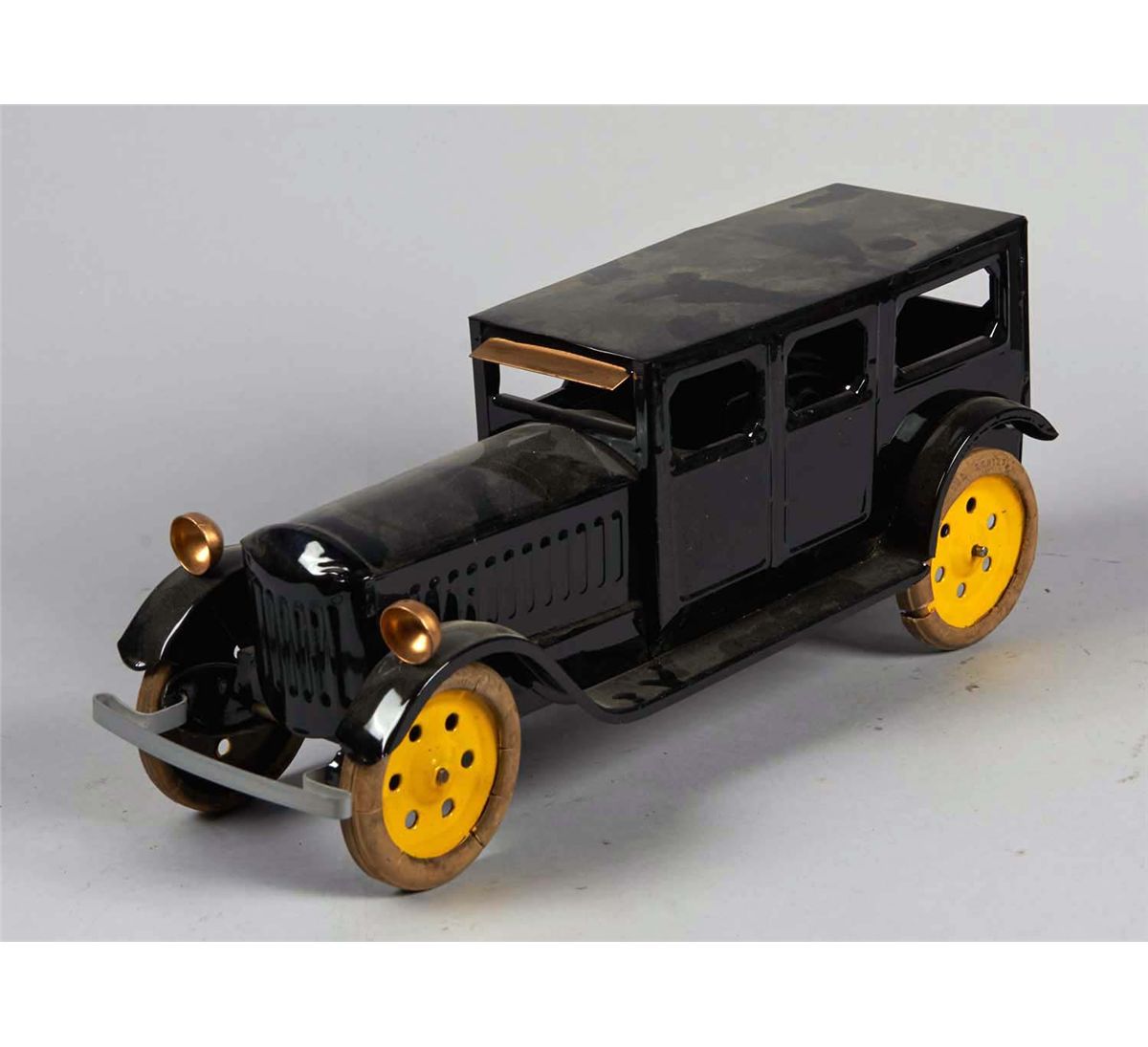 Black with white rubber tires, yellow wheels, gold visor and faux headlights. Condition (Restored). Size 17" L.