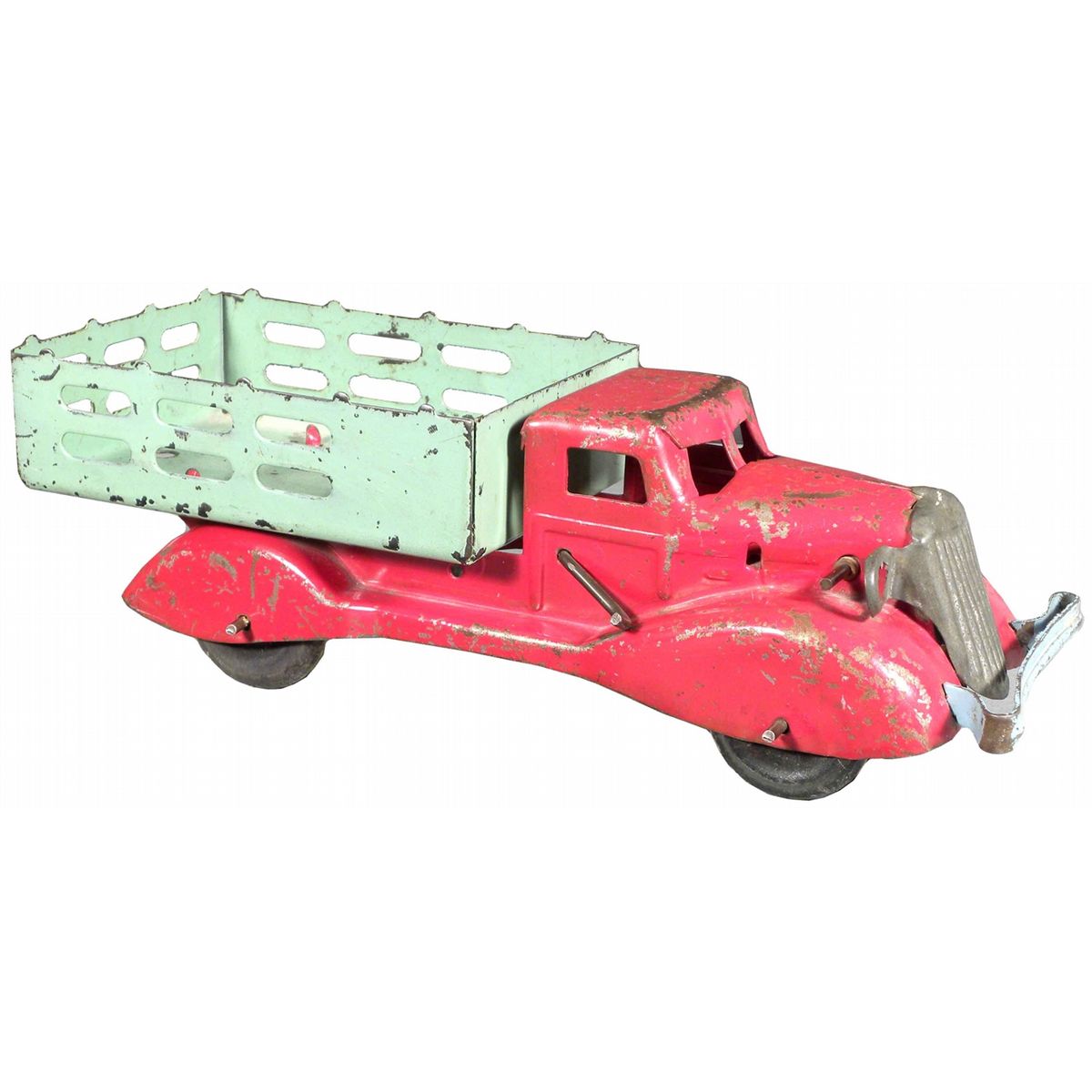 Pressed Steel Stake Bed Truck Toy, key wind. Blue/Red/Green & Black wood wheels. Normal play wear otherwise good condition. 9 1/2 inches long.