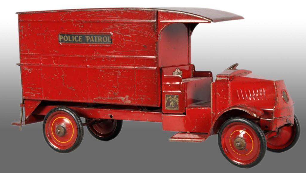 Circa 1927. "Mack" open front cab with enclosed rear body, rear step, hand railing, roof extending over cab and original "Police Patrol" decals. Fine example of a very rare truck with just some paint scratches to roof and on fenders. Condition (Very Good). Size 26" L.