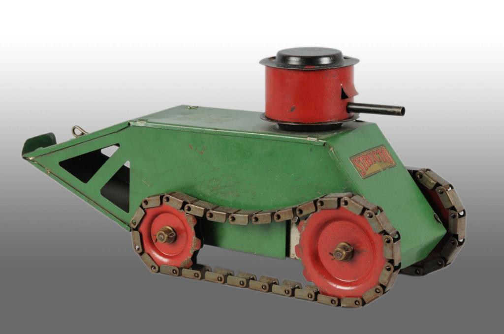 Turret on top with crank on side operating metal treads. Good decal with moderate overall play wear. Condition (Very Good). Size 12" L.