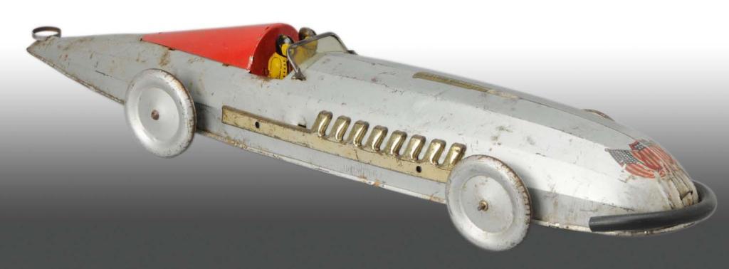 Description Circa 1926. Manufactured by Buffalo  Toys. Working. Pull-spring activated drive force  with a great dual cockpit riders design. Good  decals with some light rust on rear of body. Condition (Very Good). Size 25" L.