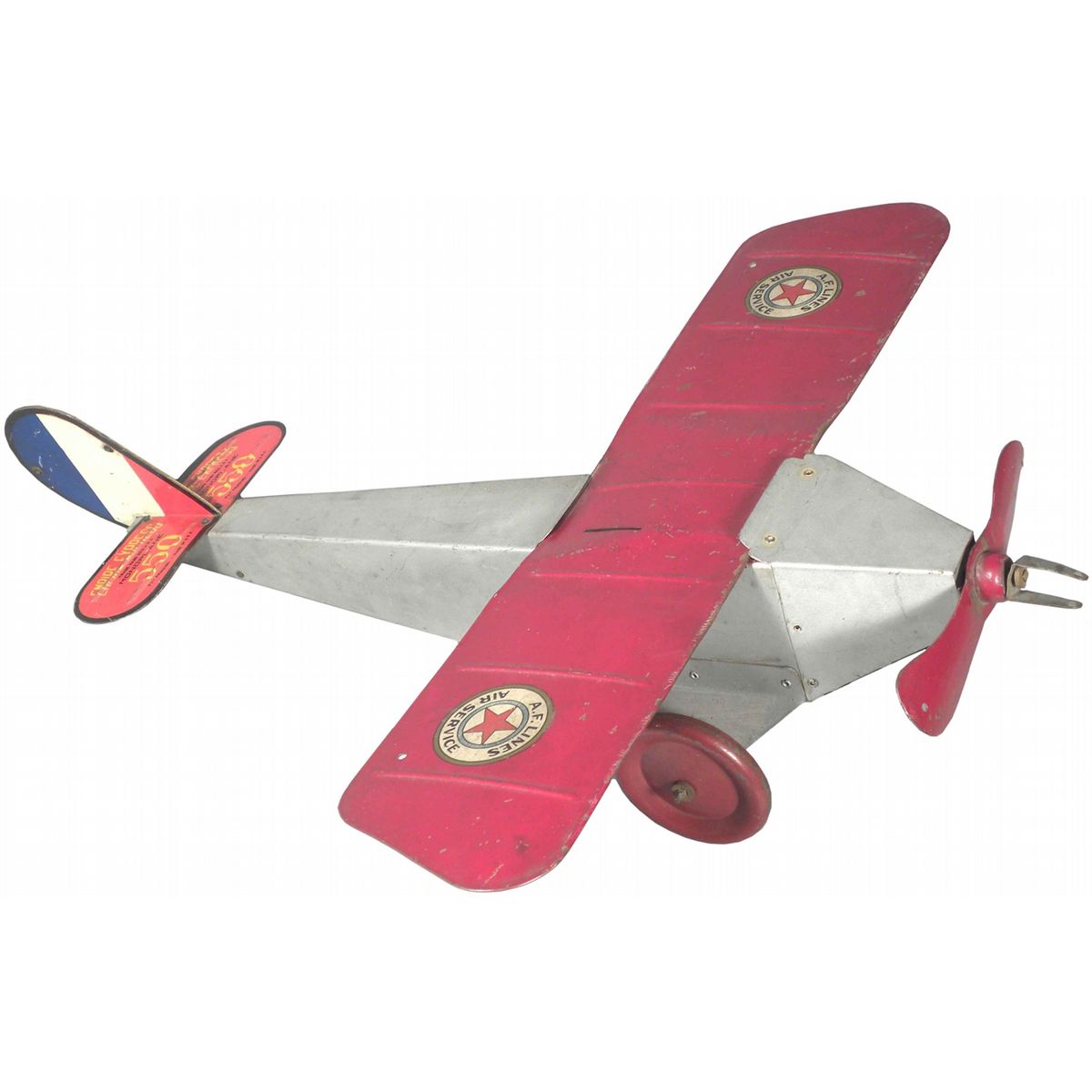 Pressed Steel Toy Air Plane. Single propeller with wood wheels. Very good condition. 18 inch wingspan.