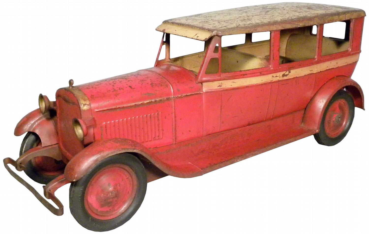 Pressed Steel Toy Sedan. Red and gold color. Scratches throughout otherwise good original condition. 26 1/2 inches long.