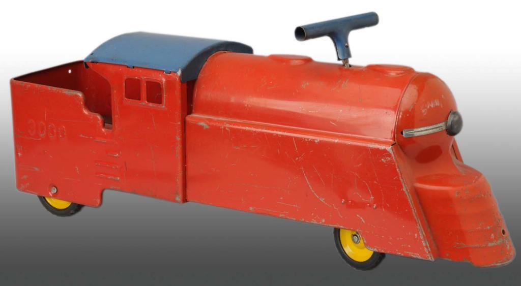 Description American. Includes handle in front to hold onto while riding on cab of train engine. Engine and tender are conjoined marked "3000" on both sides of tender with moderate overall scratching and wear. Condition (Very Good). Size 26" L.
