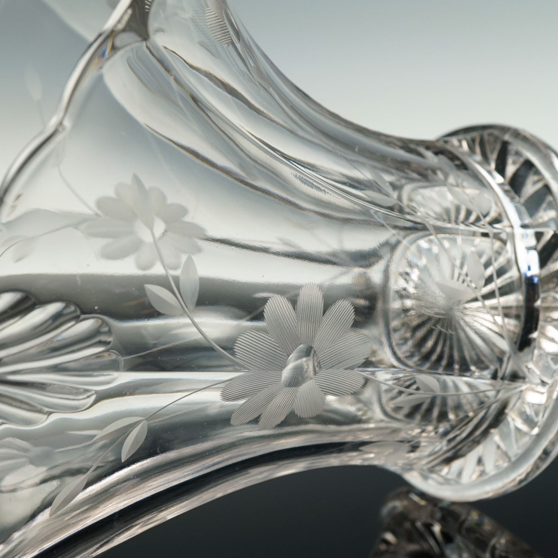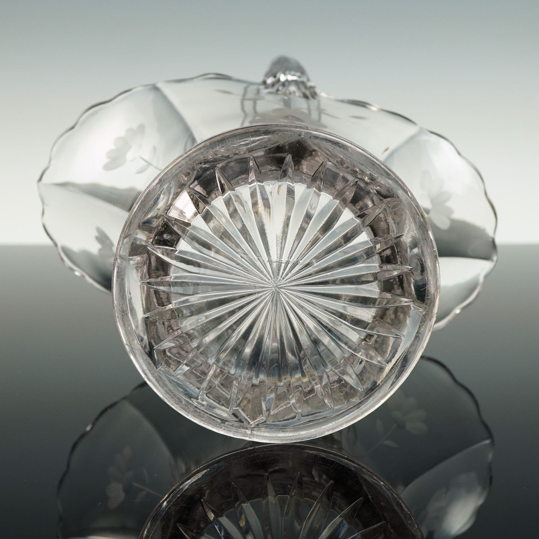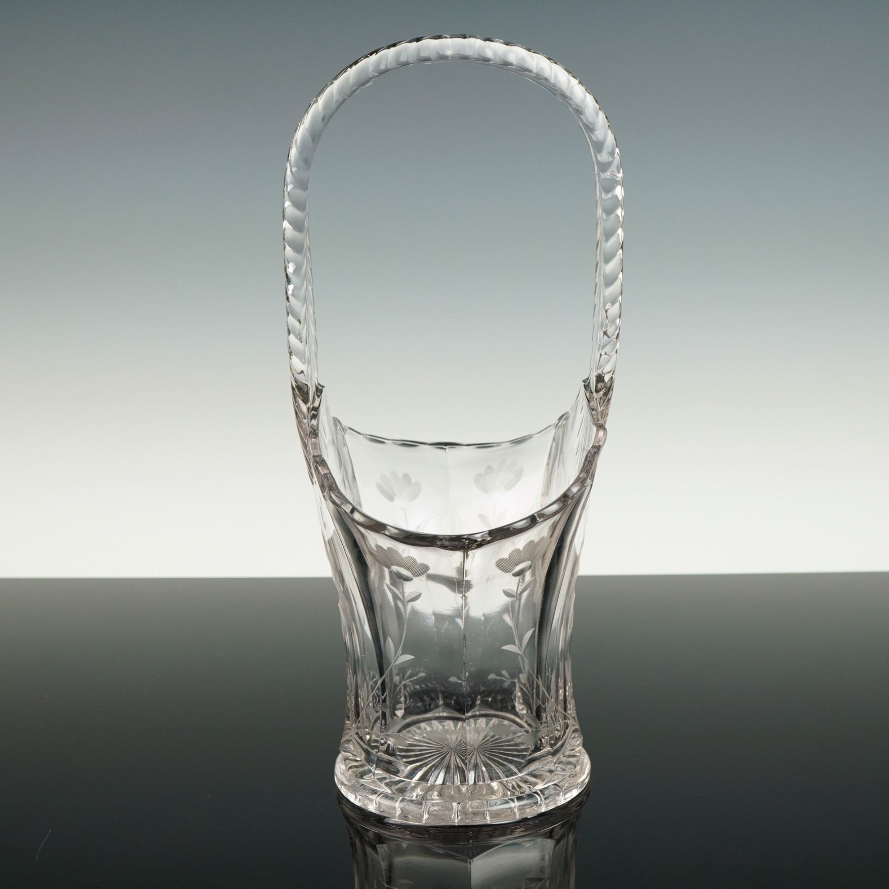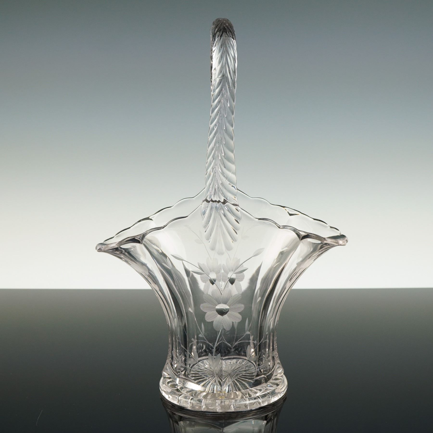 A delicate pressed glass basket featuring an arched twisted handle and scalloped rim. The body is decorated with finely etched floral motifs, including stylized daisy-like blossoms with veined petals and slender stems. The square, star-cut base and paneled body lend structure and sparkle to the form. Likely mid-20th century American or European production, this basket blends decorative charm with functional elegance, ideal for display or table use.