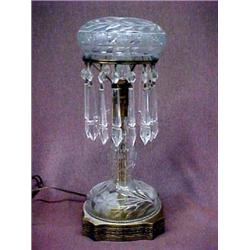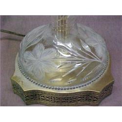 Pressed and wheel cut glass lamp, round shade on metal fitting, with cut prisms, pear shaped standard on round base, attached spelter base, early 20th C., measures 15 1/2" high