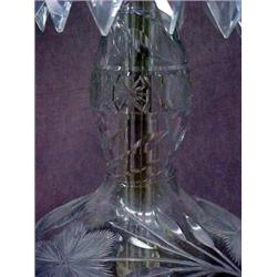 Pressed and wheel cut glass lamp, round shade on metal fitting, with cut prisms, pear shaped stan...
