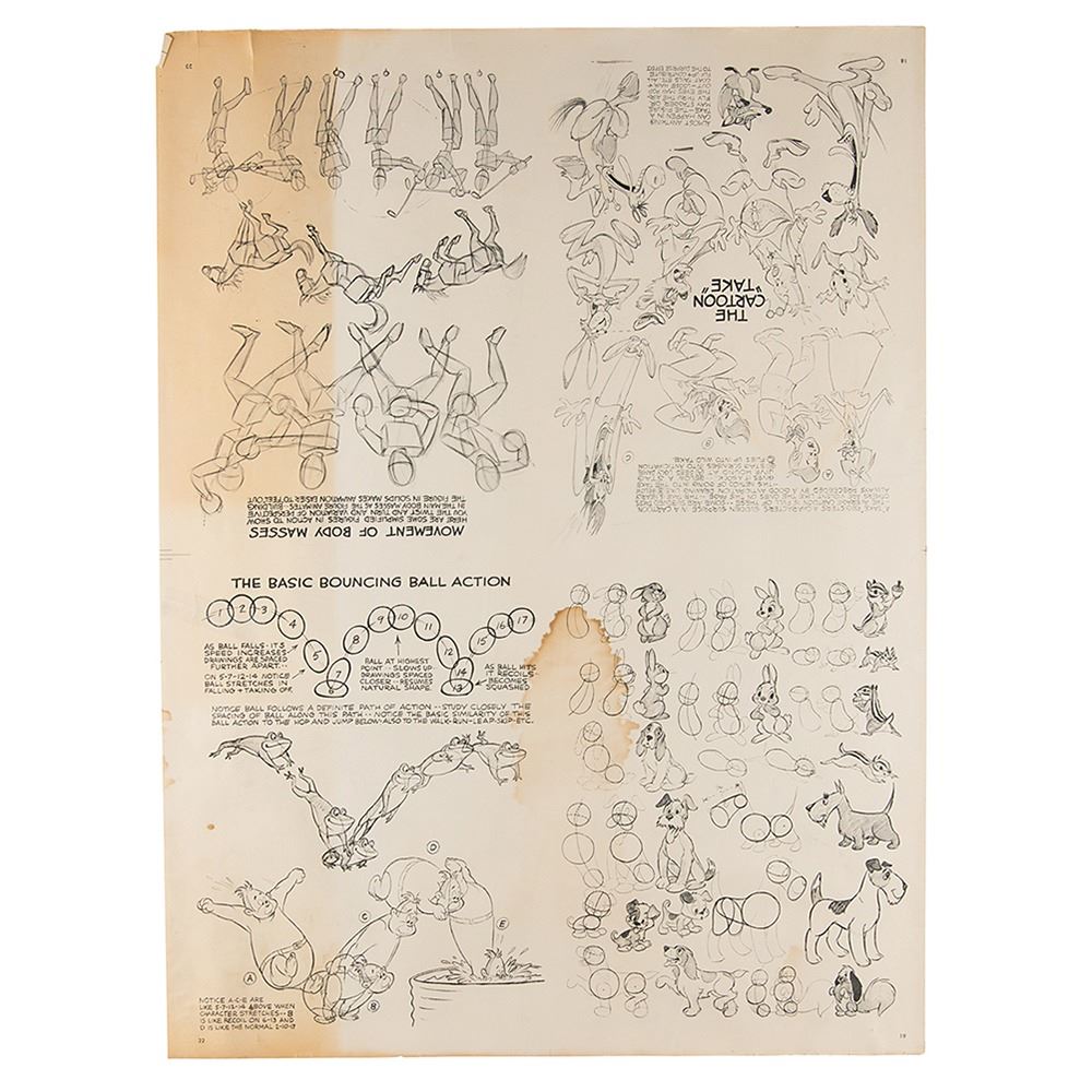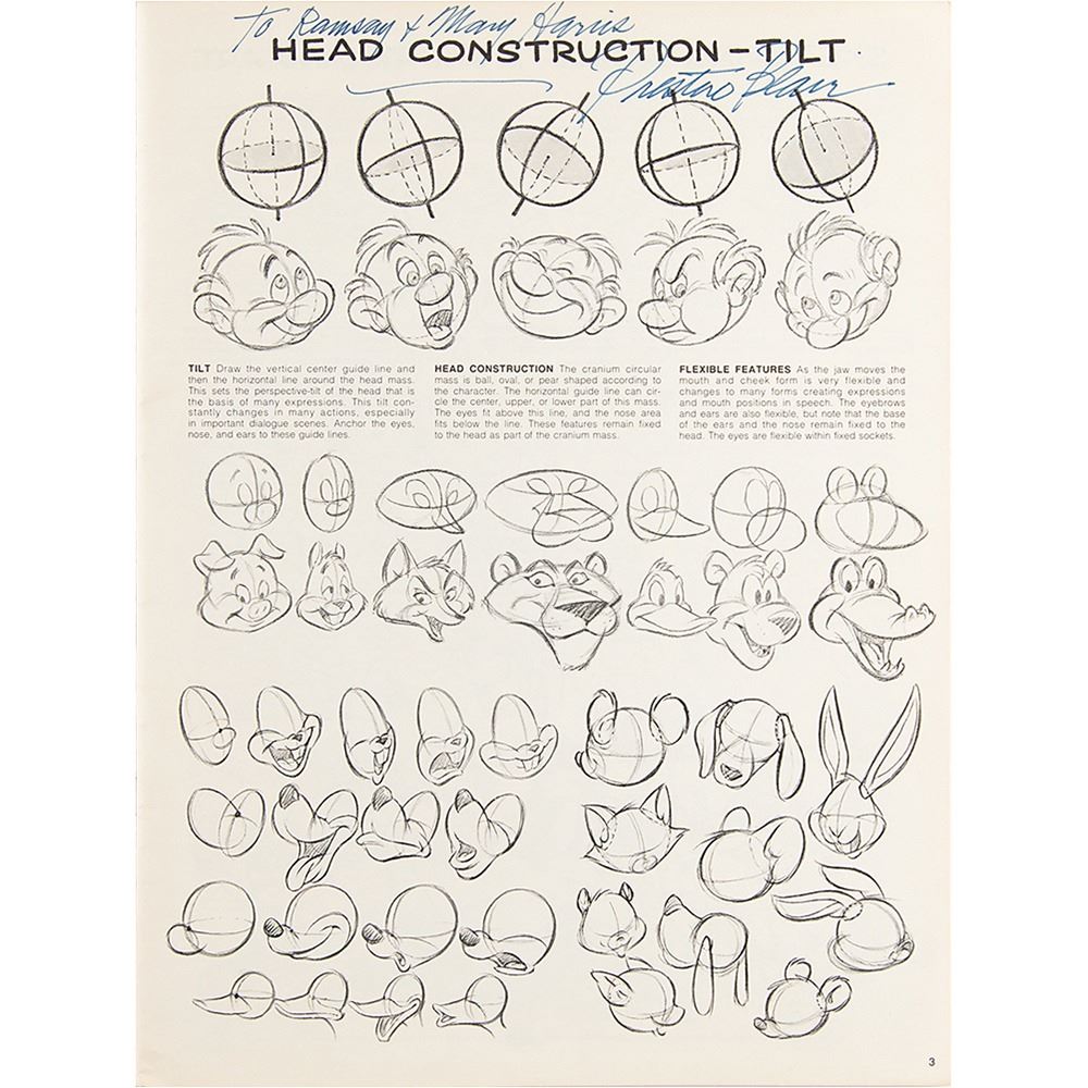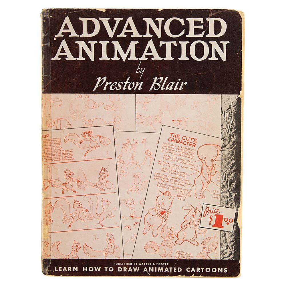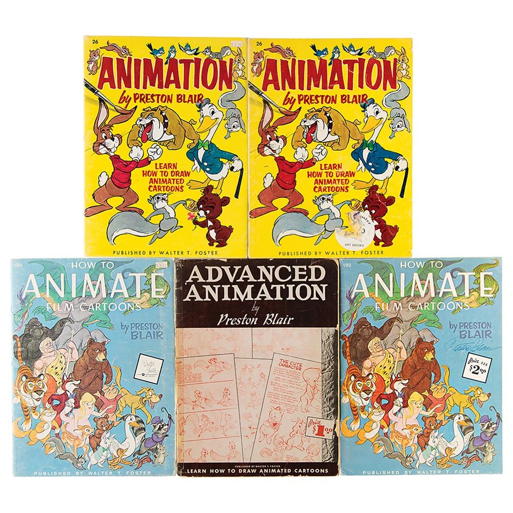 Collection of five softcover animation books by Preston Blair, highlighted by a rare first edition of Advanced Animation, 40 pages, 10.25 x 13.75, published by Walter T. Foster in 1947 and now widely considered to be the most important animation book ever created. Also included: two 1980 editions of Blair’s How to Animate Film Cartoons, both 38 pages, 10.25 x 13.75, with one signed on the front cover in blue ink by Blair, who signs and inscribes the first page, “To Ramsay & Mary Harris, Preston Blair,” and who makes a couple of handwritten corrections to pages 20 and 21, “Arrangement for Drama” and “1st Edition mistake”; and two 1985 editions of Blair’s Animation, both 40 pages, 10.25 x 13.75, which are accompanied by three oversized printers page proofs for Animation, ranging in size from 42.5 x 28.5 and 21.25 x 28.5, which contain proof text and imagery for pages 2, 3, 6, 7, 9–32, 34, 35, 38, and 39. In overall very good to fine condition, with Advanced Animation bearing a tape-repaired spine, and all books showing wear to edges and covers, which includes some creases and stains to inner pages; the proofs are rolled and contain noticeable staining, as well as tears and paper loss to edges.