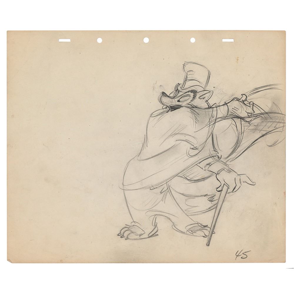 (Walt Disney Studios, 1940) Original rough production drawing of Honest John from Pinocchio by noted character animator Preston Blair, depicting the con artist fox, J. Worthington Foulfellow, sweeping back his cape in a full-length pose. Accomplished in graphite on untrimmed 12 x 10 animation paper marked "45" in the lower right. Character image measures 7.25 x 7.75. In fine condition. An early drawing of this decidedly rare Pinocchio villain.