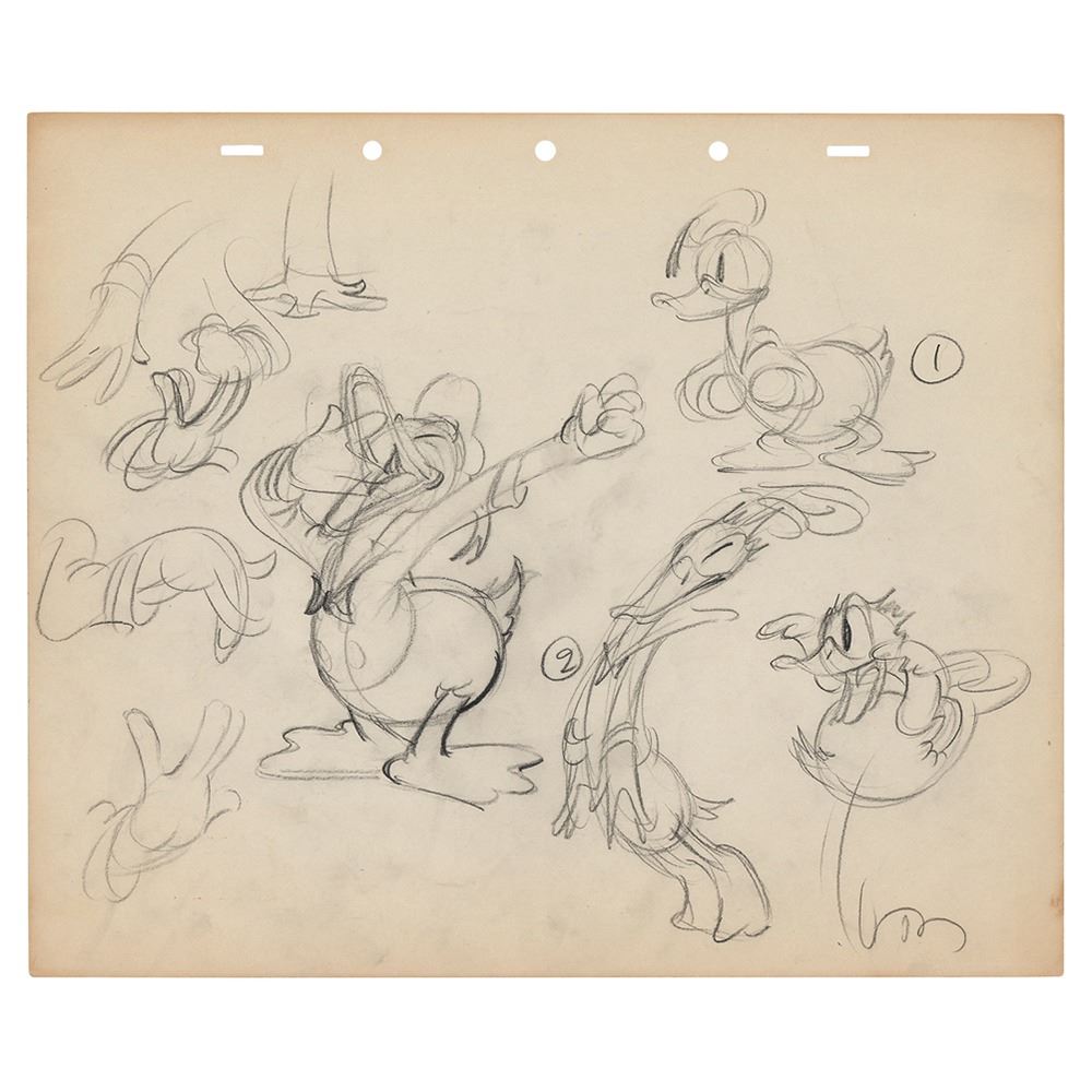 (Walt Disney Studios, 1937-1941) Original preliminary model sheet drawing of Donald Duck by noted character animator Preston Blair, showing Donald in four full-length action poses in addition to a group of six different hand-arm movement sketches. Accomplished in graphite on untrimmed 12 x 10 animation paper. Total character image measures 11 x 8.75. In fine condition.