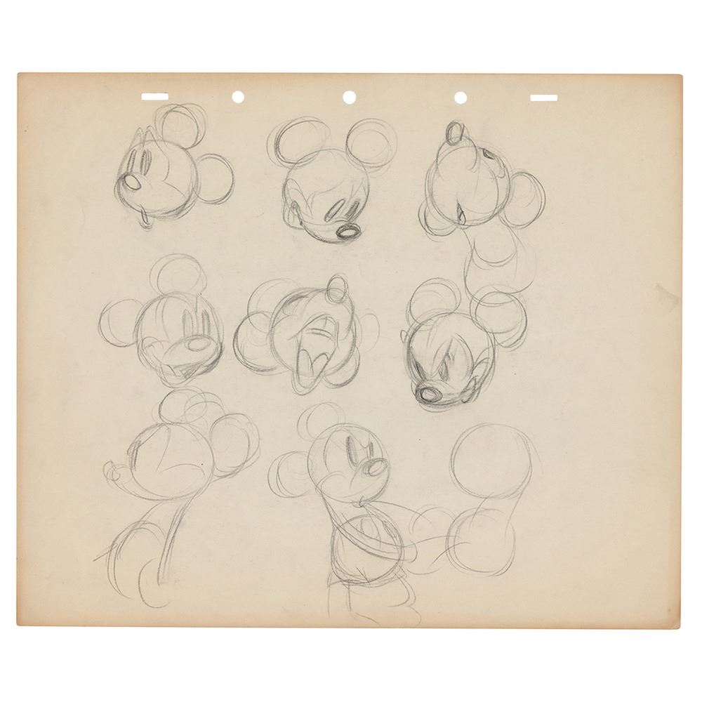 (Walt Disney Studios, 1937-1941) Original preliminary model sheet drawing of Mickey Mouse by noted character animator Preston Blair, featuring nine different sketches of Mickey showing varying degrees of emotion. Accomplished in graphite on untrimmed 12 x 10 animation paper. Total character image measures 8 x 9. In fine condition.