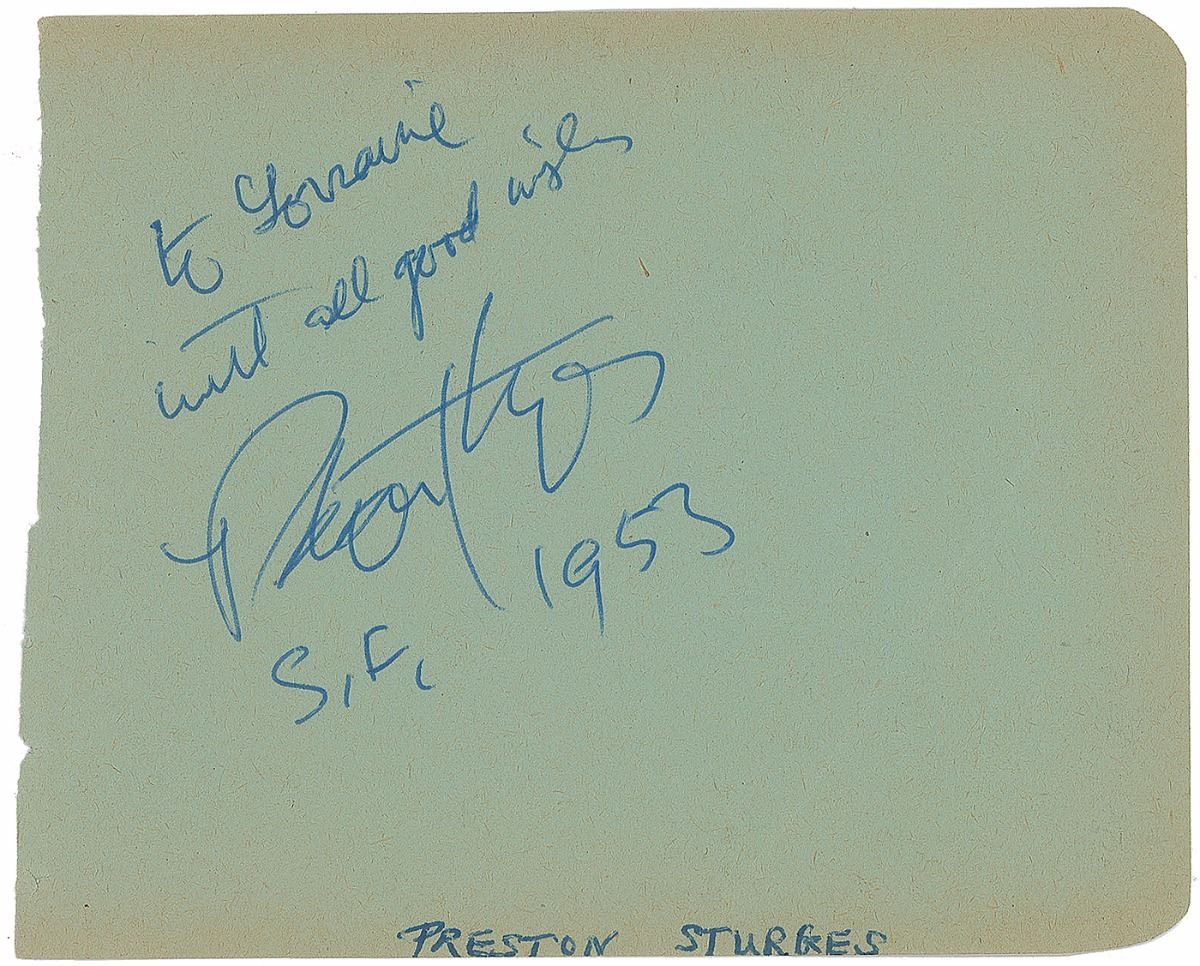 Academy Award–winning American director and screenwriter (1898–1959) best known for fast-paced screwball comedies like Sullivan’s Travels, The Palm Beach Story, and Lady Eve. Vintage ballpoint signature and inscription, “To Lorraine, with all good wishes, Preston Sturges, S. F. 1953,” on a green 5.5 x 4.5 album page. Collector’s notation to bottom edge. In fine condition.