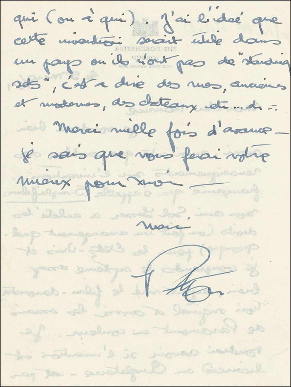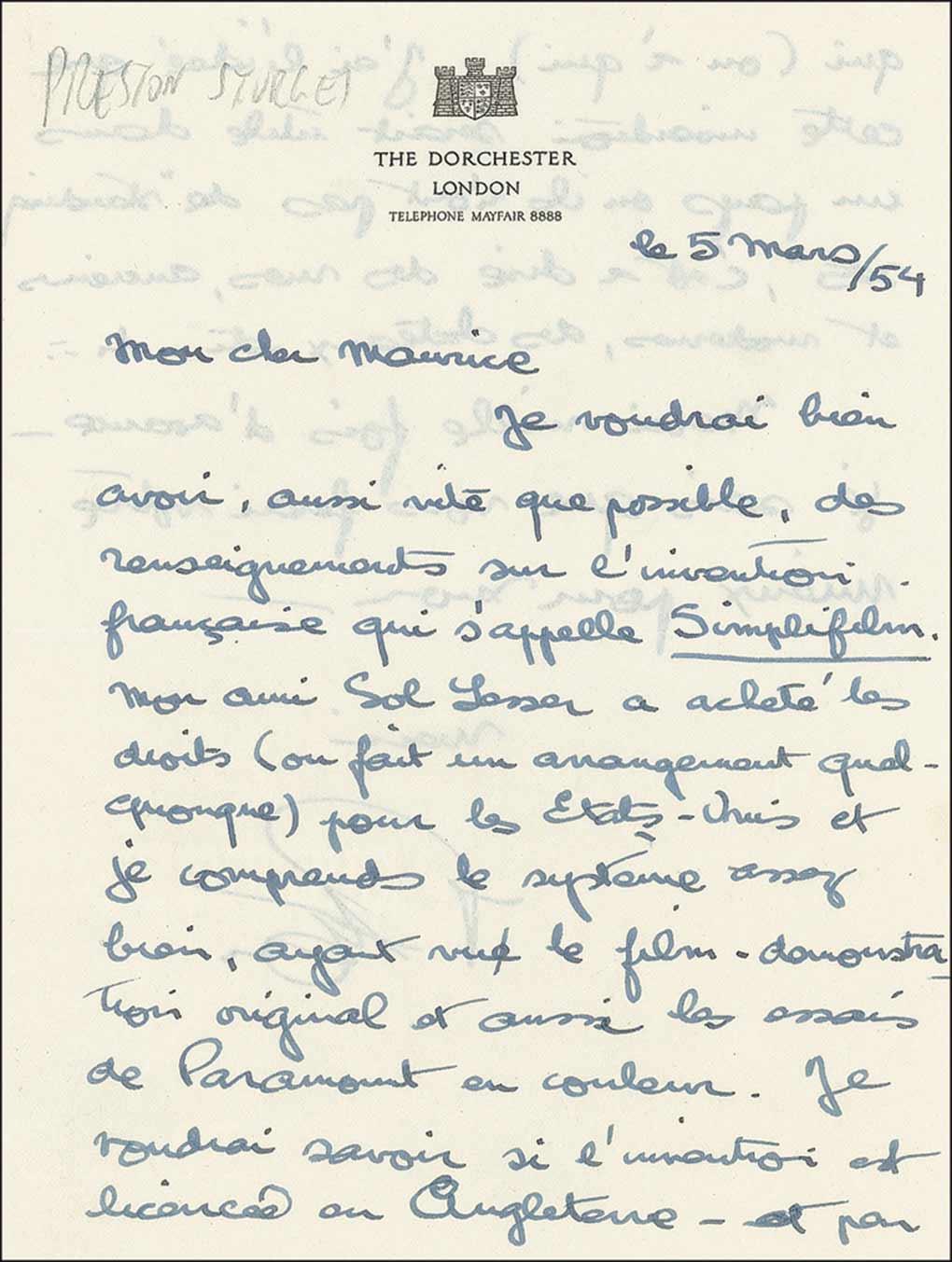 Academy Award–winning American director and screenwriter (1898–1959) best known for his fast-paced, cleverly scripted screwball comedies. ALS in French, signed “Preston,” one page both sides, 5.25 x 7, The Dorchester, London letterhead, March 5, 1954. Sturges writes to Maurice [evidently his cinematographer, Maurice Barry], asking about a French invention called Simplifilm, which is about to be demonstrated in the United States. In fine condition.