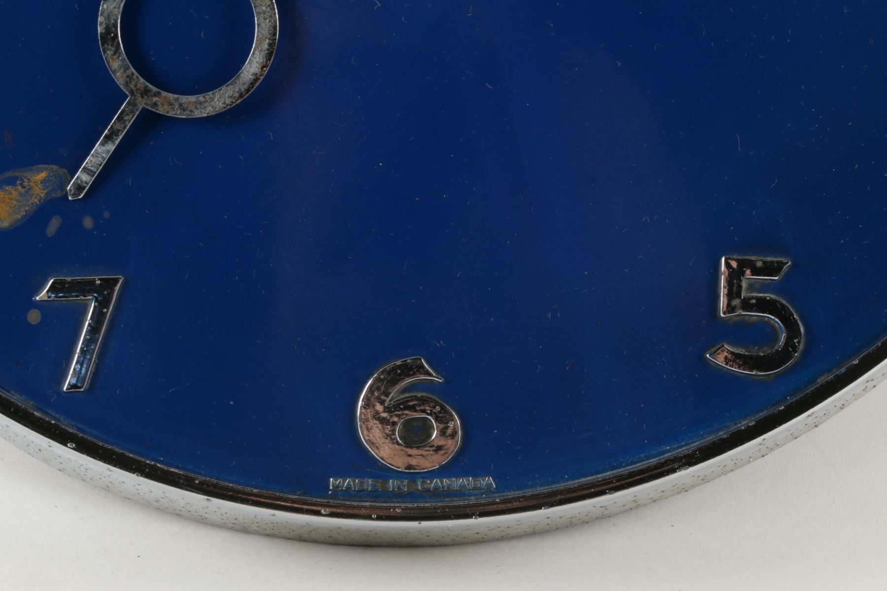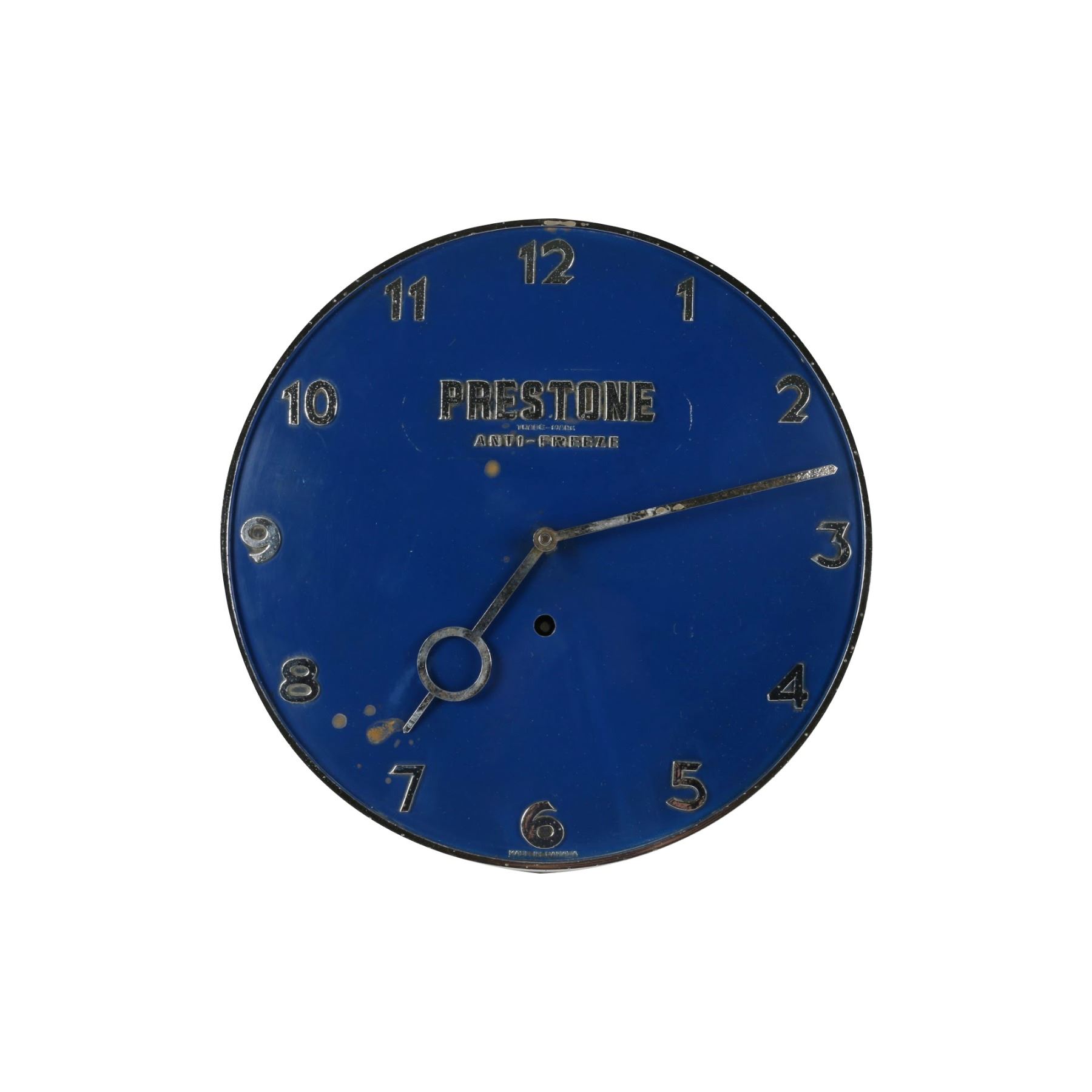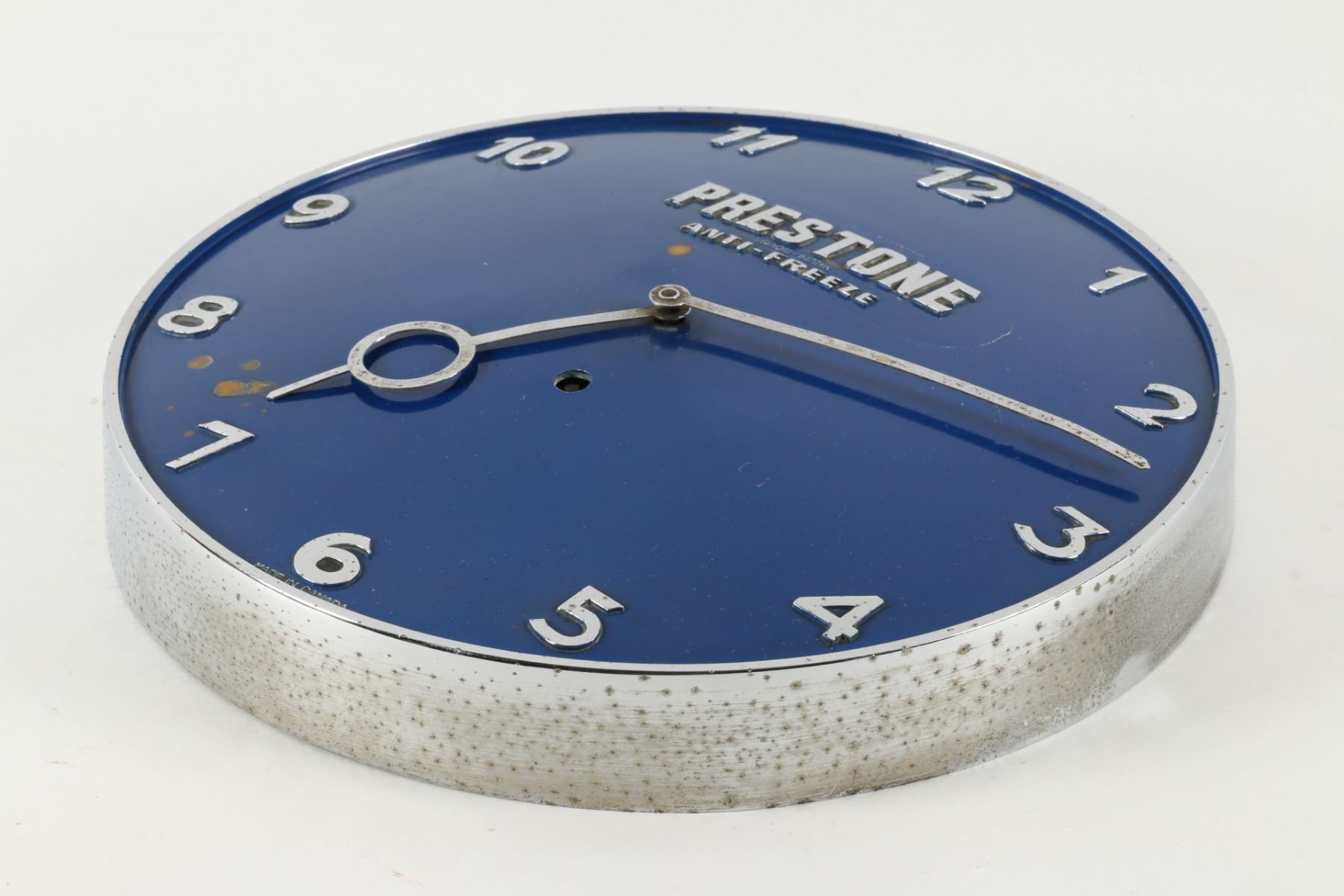 Circa 1940. Marked "Made in Canada", lower edge. Spring-driven, key-wound mechanism. 9.75" x 1.5". Untouched original condition. Minor rust spots. Pitting to outer rim. $150-250.