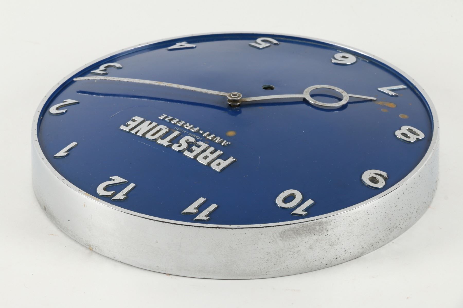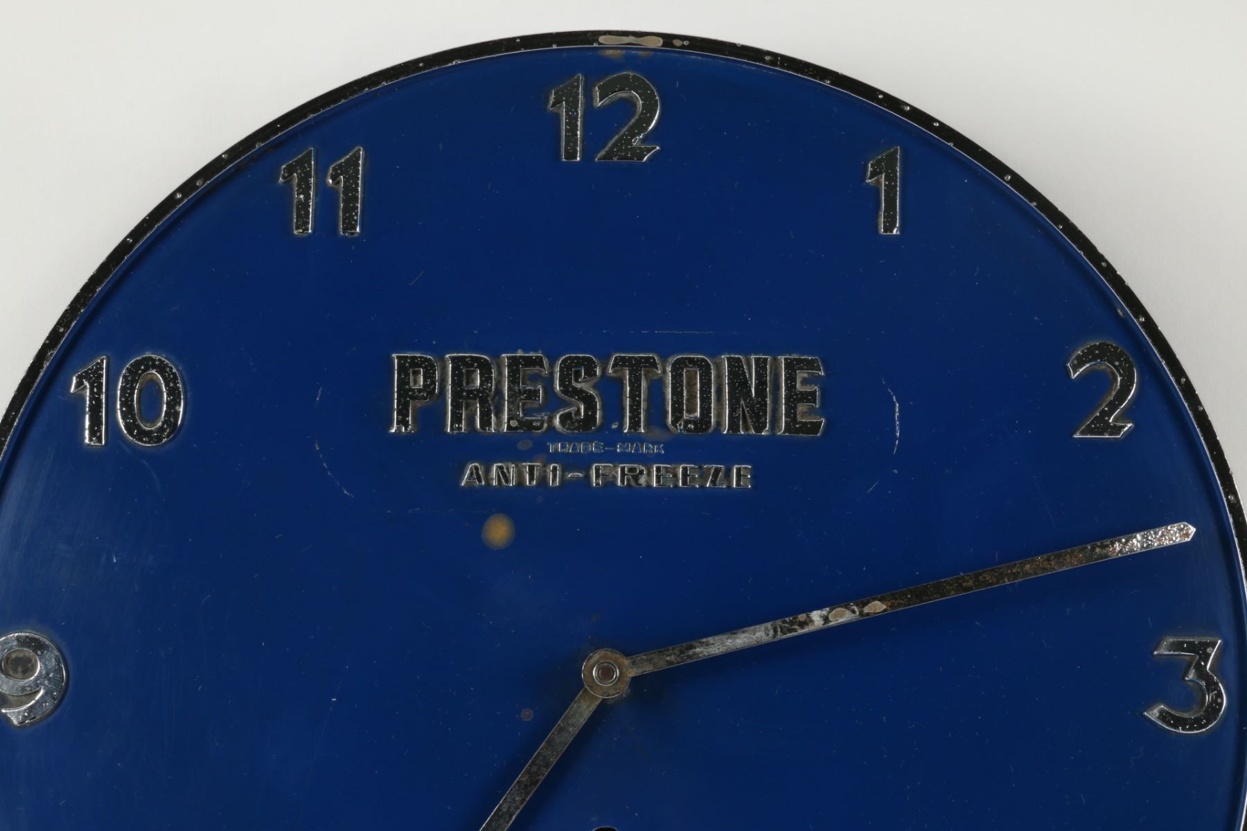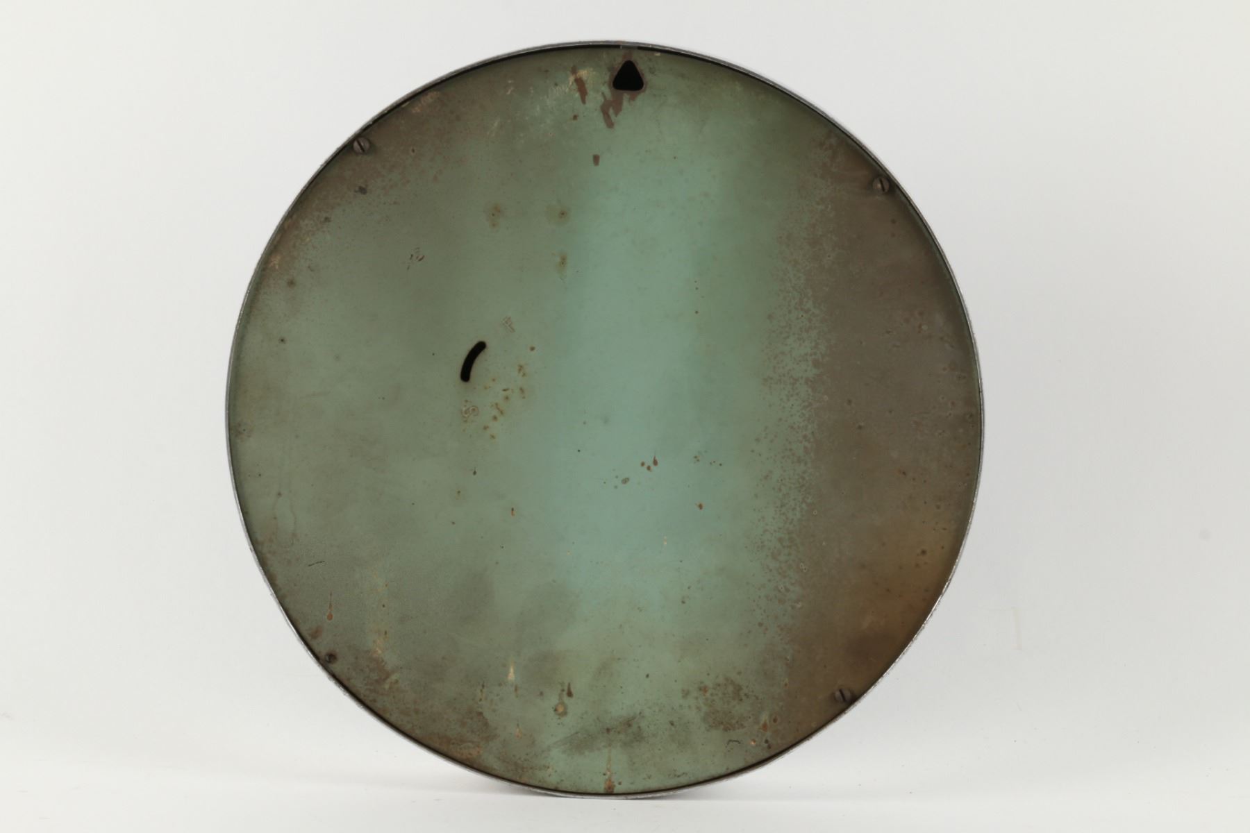 Circa 1940. Marked "Made in Canada", lower edge. Spring-driven, key-wound mechanism. 9.75" x 1.5". Untouched original condition. Minor rust spots. Pitting to outer rim. $150-250.