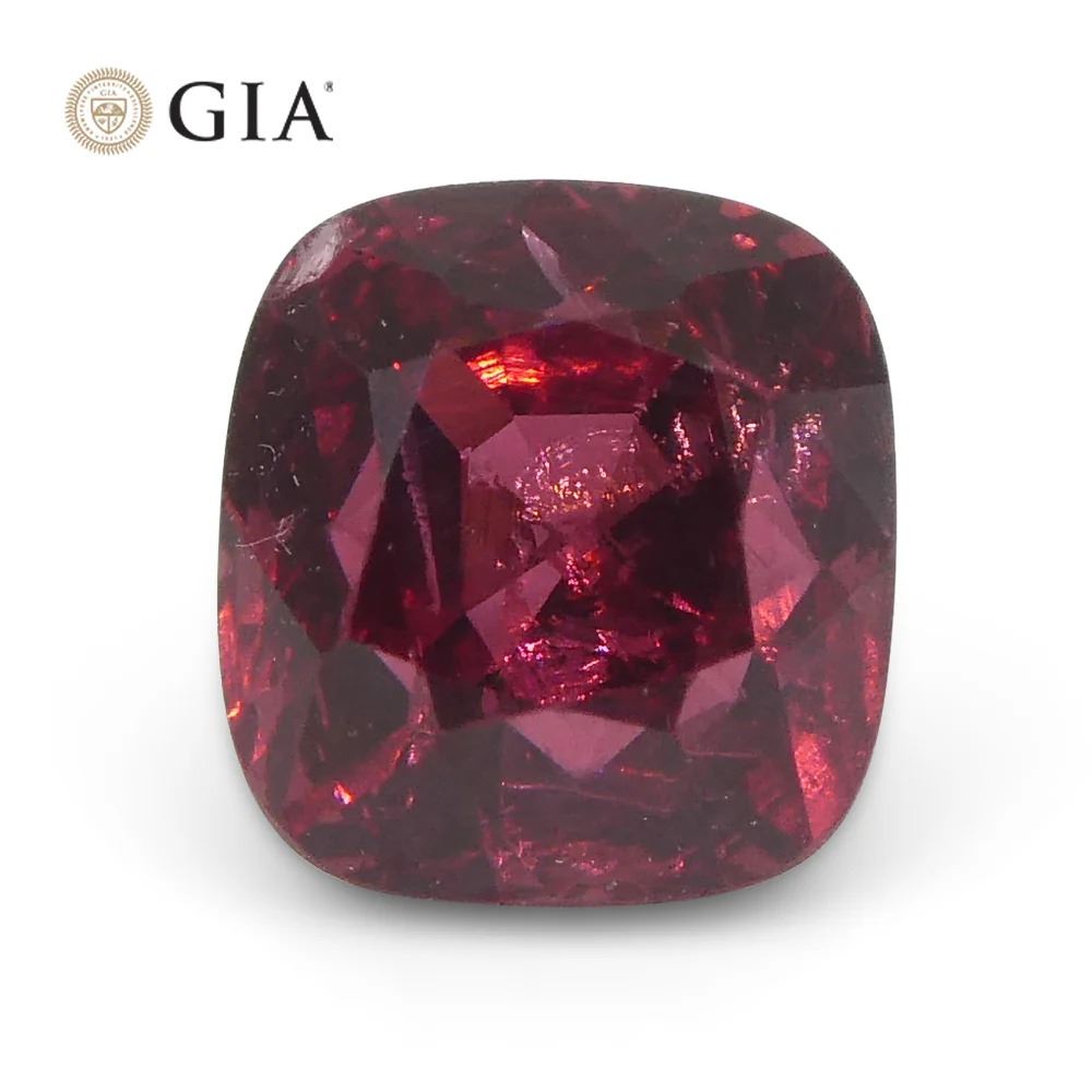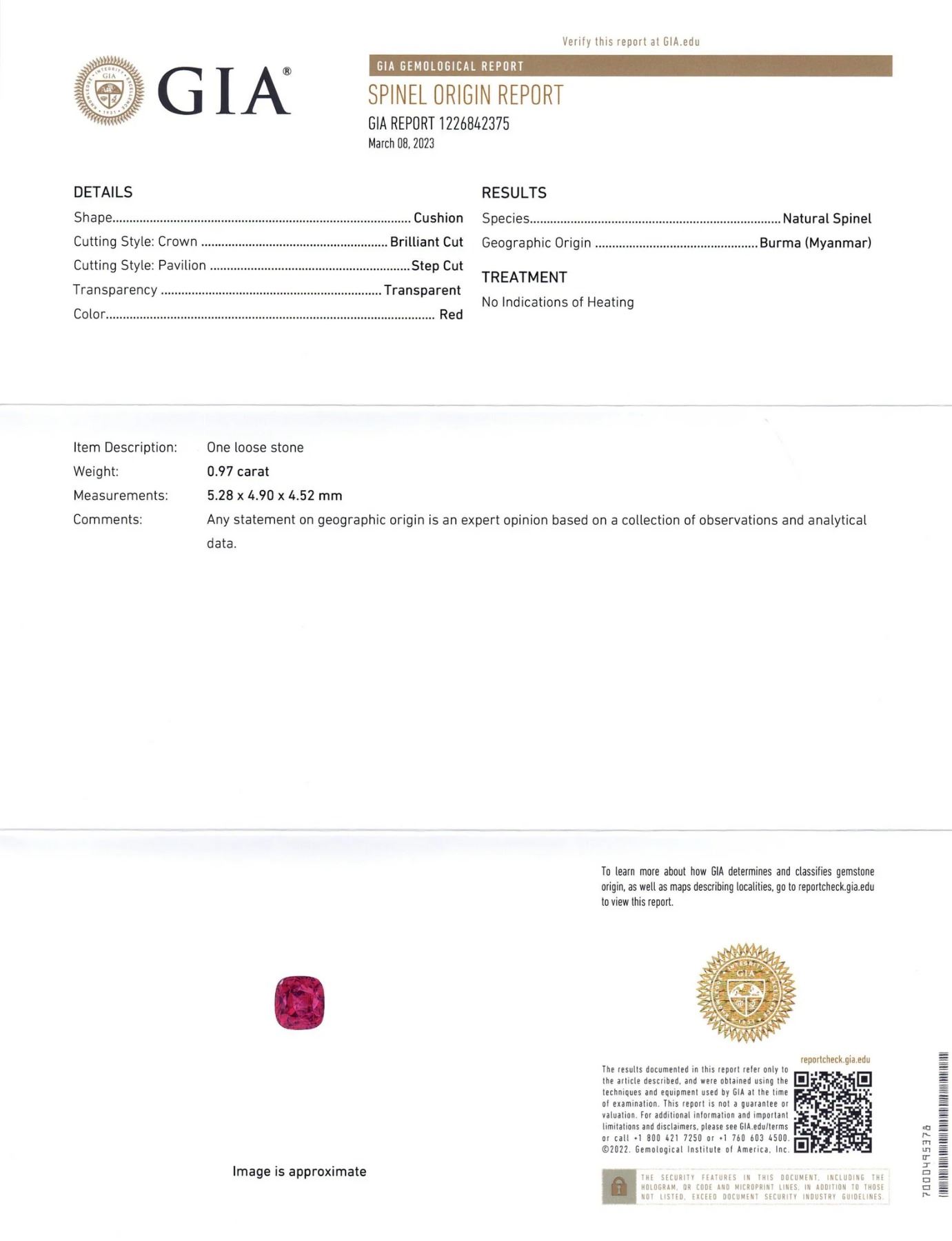 Dazzling 0.97 Ct Red Spinel is a cushion brilliant cut measuring 5.28 x 4.90 x 4.52 mm. Showcases strong saturation with a medium tone. Absolutely gorgeous! Origin: Burma (Myanmar). Treatment: None. Please see the certification for additional information.