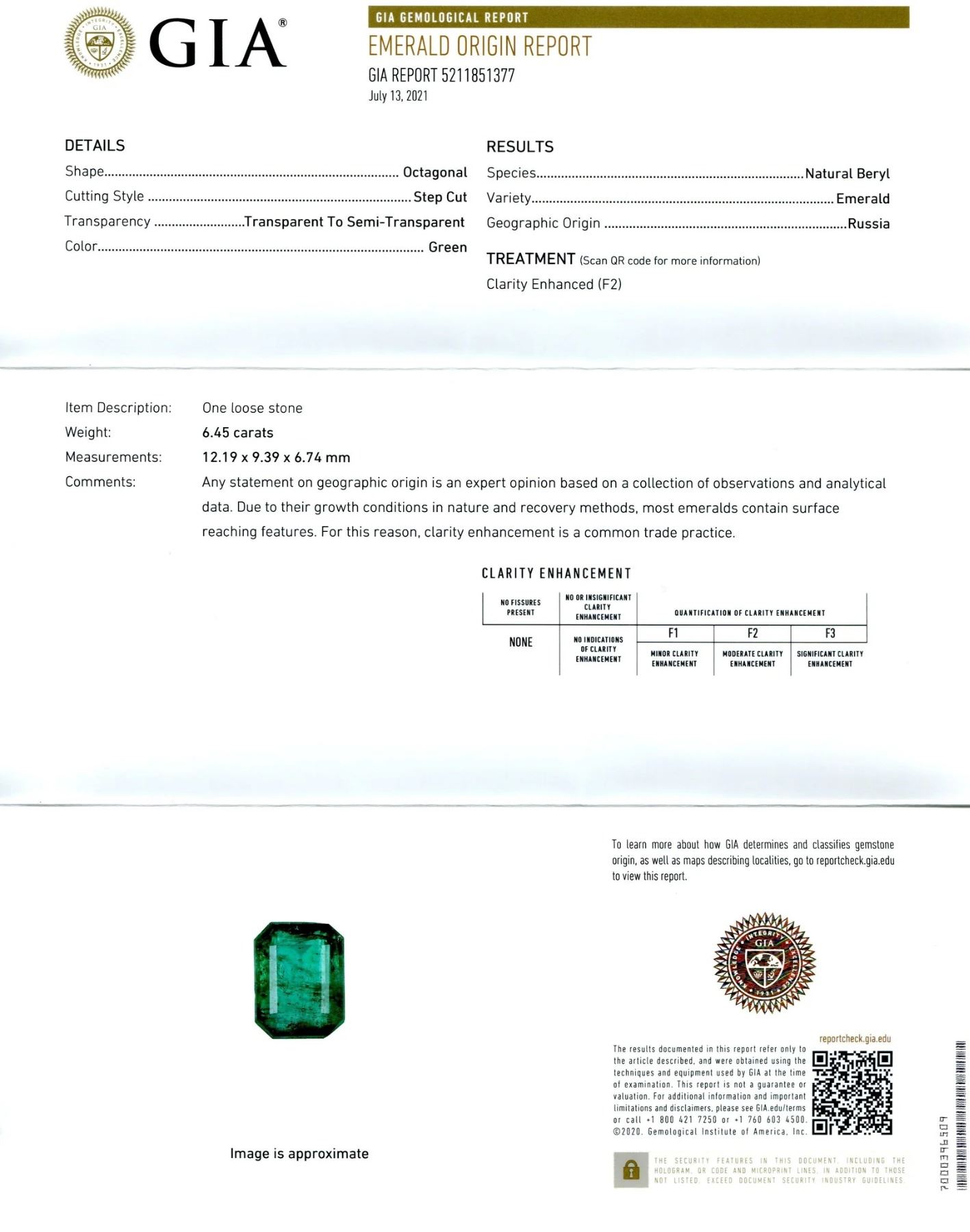 This is a 6.45 Ct Green Emerald measuring 12.19 x 9.39 x 6.74 mm with an Emerald Cut. Showcases a Strong Saturation and a Dazzling Green hue and is ready to mount! Origin: Russia. Please see the certification for additional information.
