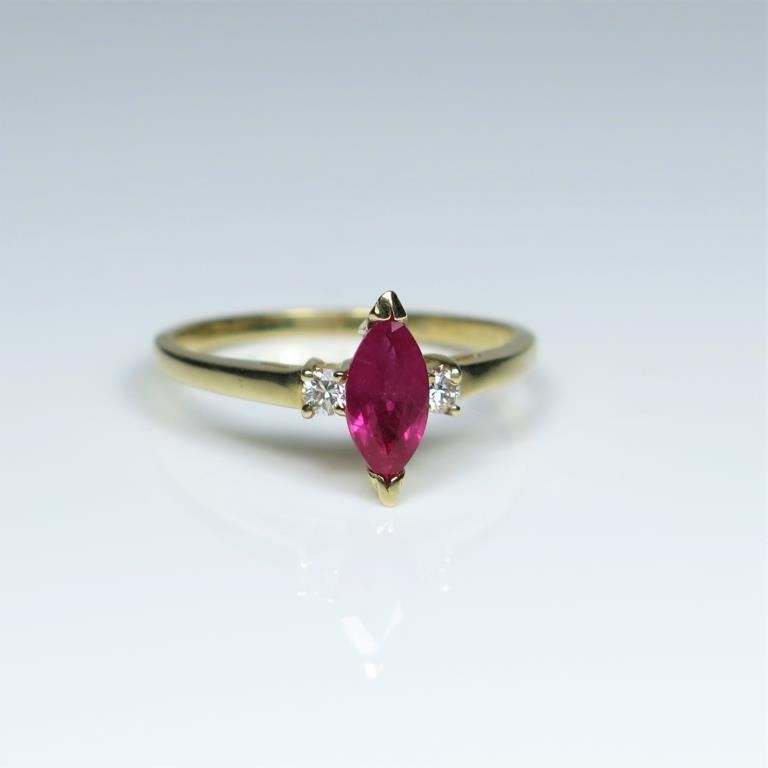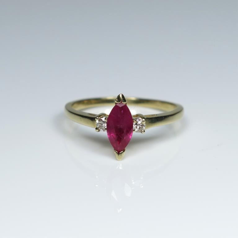 Pretty Burmese colored Ruby and Diamond Ring featuring a marquise cut Ruby weighing approx. 0.80 carats with rich red color accented with 2 round cut Diamonds set in 14 karat yellow gold. Estimates $600-$900