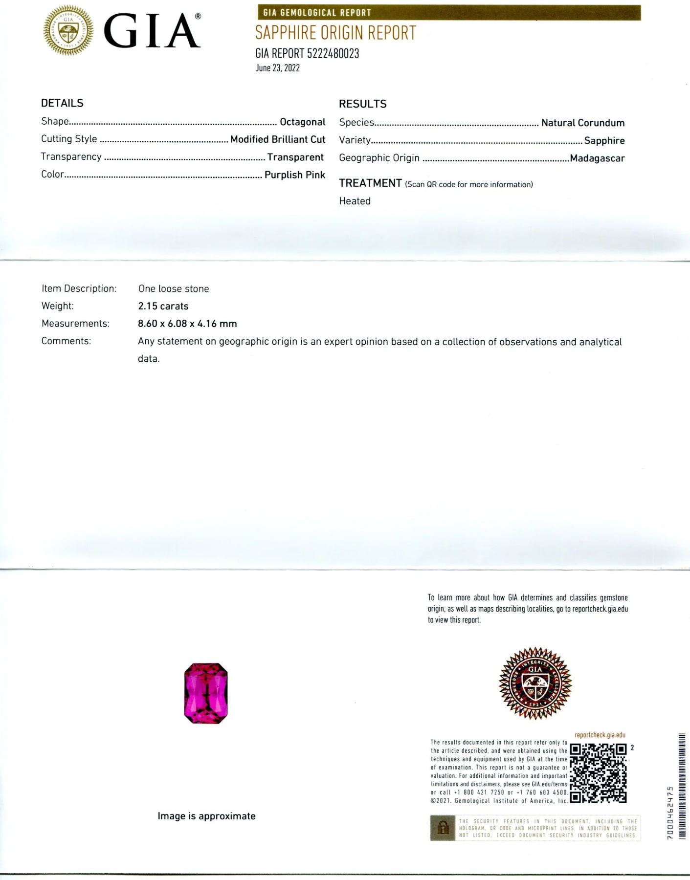 Dazzling 2.15 Ct Purplish Pink Sapphire is an emerald cut measuring 8.60 x 6.08 x 4.16 mm. Gorgeous hue and medium tone. Do not miss this one! Origin: Madagascar. Treatment: Heat only. Please see the certification for additional information.