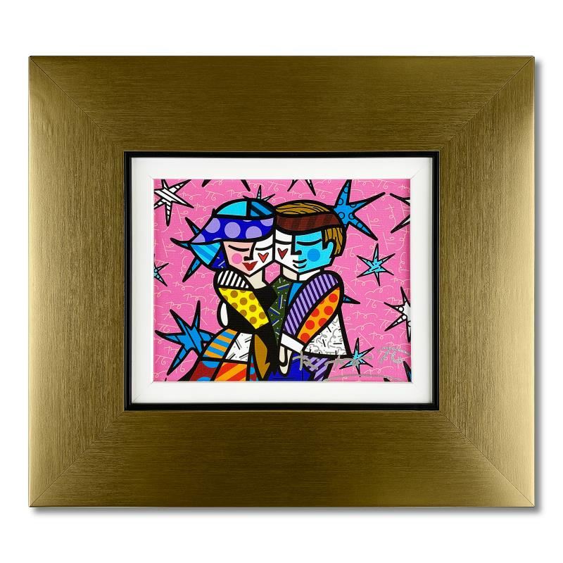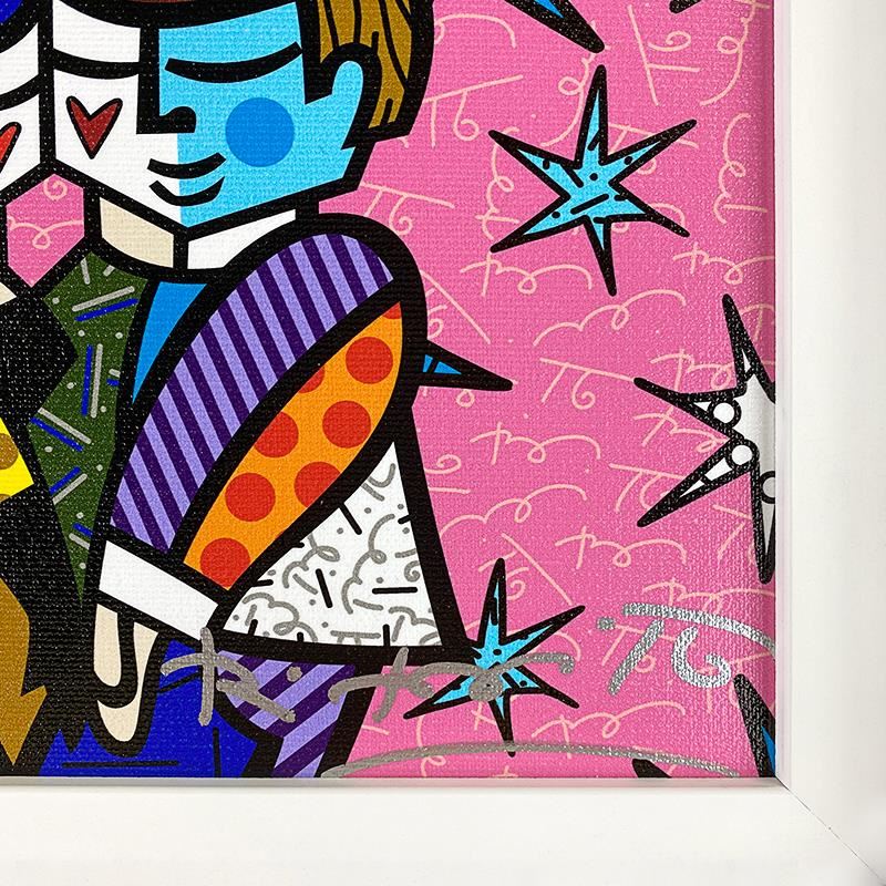 "Pretty In Pink Mini" is a framed open edition giclee on canvas by Romero Britto. The piece comes hand signed by the artist and is authenticated en verso with the official Britto stamp. Measures approximately: 13.5" x 15" (framed), 6.5" x 8" (image).