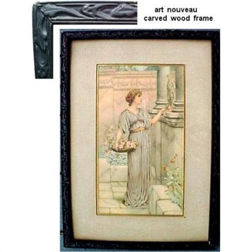 Art Nouveau carved frame with portrait print of beautiful lady in ancient Greece. This antique carved wood frame contains a tinted etching of a pretty lady gathering roses in an atrium built of pink carved marble wall, white marble floor and architectural columns. The lovely maiden lays a rose at the feet of a statue (perhaps a god). Art nouveau black carved frame contains double mat that includes gold narrow edge. Frame 10x14 inches. Photos taken under glass are hazy, but print is crisp, the colors soft and sophisticated, mat of beige tone. Back bears traces of gold paint and black paper seal. No artist or publisher's name. Ca 1900 etching and frame both in excellent condition. Perfect for Greek Revival home decor.