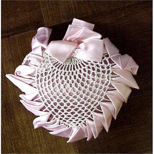 It is very pretty and made from satin, bows and crocheted lace, Measures about 5" by 4 3/4" - Very good condition, free of stains or holes , Ready to be used or displayed - We prefer Paypal - Thank You so much for looking!