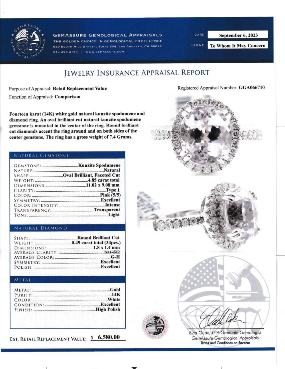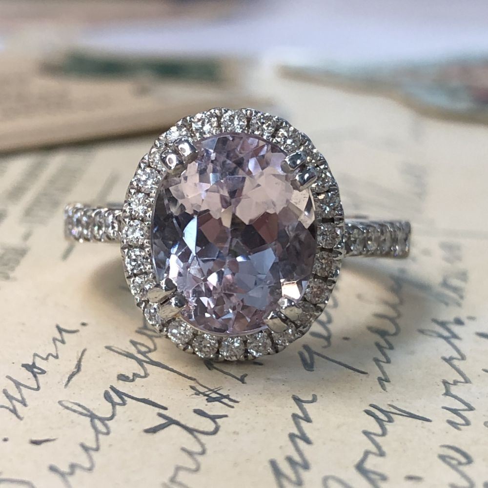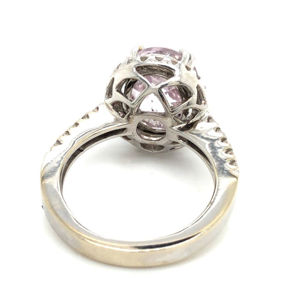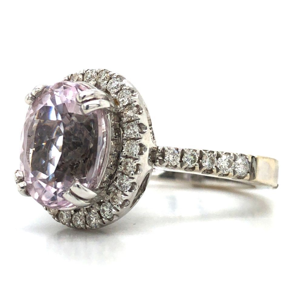 ADDITIONAL INFORMATION: A chiffon-soft pink colored kunzite is double prong-set in a white gold ring with appropriately sized and respectable quality diamonds in the halo and on the shoulders.& nbsp;& nbsp;