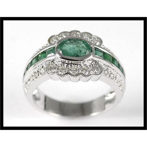 This sparkle 18K white gold ring contains with an oval shape emerald set in the center weighing approximately 0.70 carats. On the side is 12 square cut emeralds weighing approximately 0.70 carats total weight. 30 round diamonds are also set on this ring that have an estimated total weight of 0.50 carats. This ring weights 6.0 grams and is in size 7.