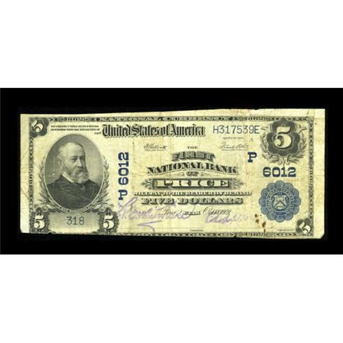 <B>Price, UT</B></I> - $5 1902 Plain Back Fr. 608 <B>The First NB</B></I> Ch. # (P)6012<BR> A tough bank in large size, with just about a dozen examples known. <B>Very Good-Fine,</B></I> with the bottom margin trimmed into the design on the left. <BR><I>From The Kansas City Collection.</B></I><BR><BR><b>Shipping:</b> Coins & Currency (<a target="_blank" href="http://www.heritageauctions.com/common/shipping.php">view shipping information</a>)