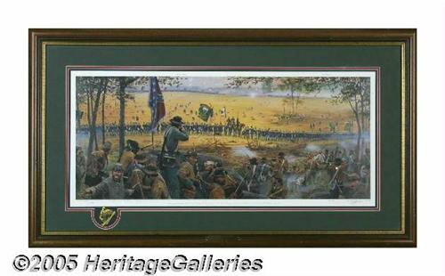 <B>"Pride of Erin" Limited Edition Print by Dale Gallon</B></I> Dale Gallon lives in Gettysburg, Pennsylvania and draws his inspiration from the heroic moments in individual men's lives written down in army documents, personal letters, and published historical data. He prides himself on the historical accuracy of his critically acclaimed Civil War art. Offered here is a beautifully matted and framed pencil limited edition print, signed and numbered (1098 / 1500), titled <I>Pride of Erin.</B></I> It shows the scene, "After crossing the Wheatfield under fire, Colonel Pat Kelly's Irish Brigade prepares to deliver their first volley against Joe Kershaw's South Carolinians holding the Stony Hill. Gettysburg, July 2, 1863," in great detail. Image size is 33" x 14" and the overall frame size is 43" x 24". A stunning print. Lot:251