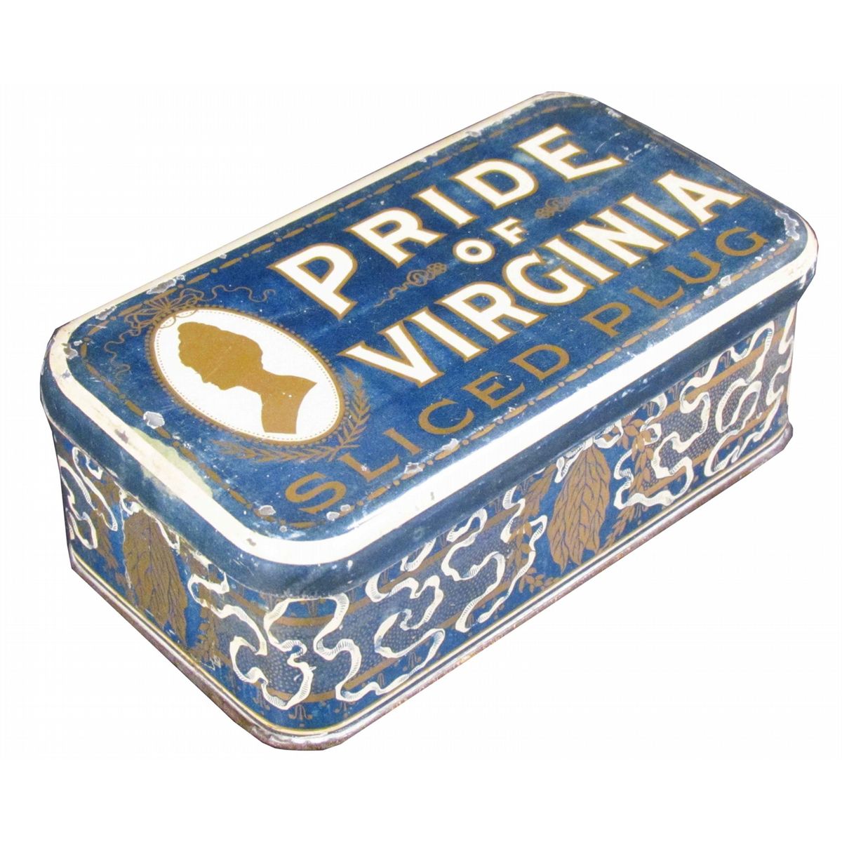 Pride of Virginia Sliced Plug Tobacco Tin. Lid is slightly faded and a couple tiny chips otherwise very good condition. 5 1/2 X 2 X 3 inches.