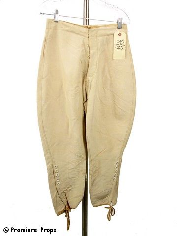 An unusual 1938 movie about a champion steeplechase horse that is blind, "Pride of the Blue Grass" used real jockey's and actors who trained for months. These are two screen-sued pair of cream colored pants worn in some of the big action sequences by Bruce Galbraith. Pants tag front reads "Waist 30. Inseam 25." and tag back says, "260"; Warner Bros. Barcode inside waist; Tag inside pants says "Bruce Galbraith. Production 260. 2/27/39" ; Pants are torn almost completely up the legs. Pair 2 = Tag reads "30"; Tag back says "260"; Label inside pants says "Bruce Galbraith. 2/27/39, Production 260."