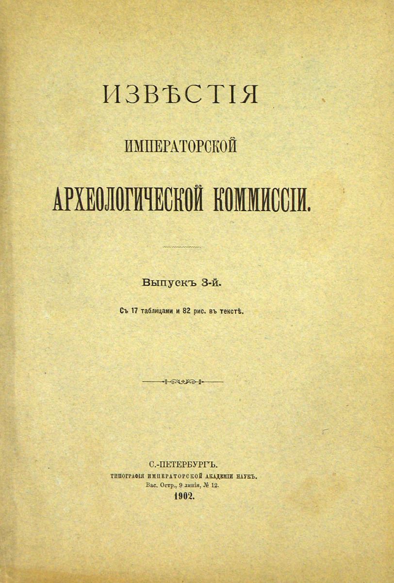 Pridik, E.M. АНАДОЛЬСКIЙ КЛАДЪ ЗОЛОТЫХЪ СТАТЕРОВЪ 1895 Г. In the Imperatorskaia Arkheologicheskaia Kommissia’s Извѣстiя Императорской Археологической Коммиссiи, Выпускъ 3-й (St. Petersburg, 1902). 4to, original printed wraps. (4), 171, (1) pages; text illustrations; 17 plates [6 lithographic plates, 6 halftones, 5 fine plates]. Pridik’s article comprises pages 58-92, 5 fine plates of coins and a lithographic alphabet chart. Printed on thick stock. Minor signs of wear. Mostly unopened and near fine. Includes Pridik’s well-illustrated description of the Anadol hoard of gold staters. Very scarce. Yakovchuk 281.