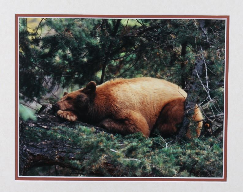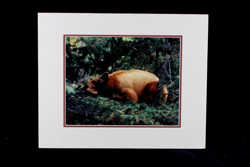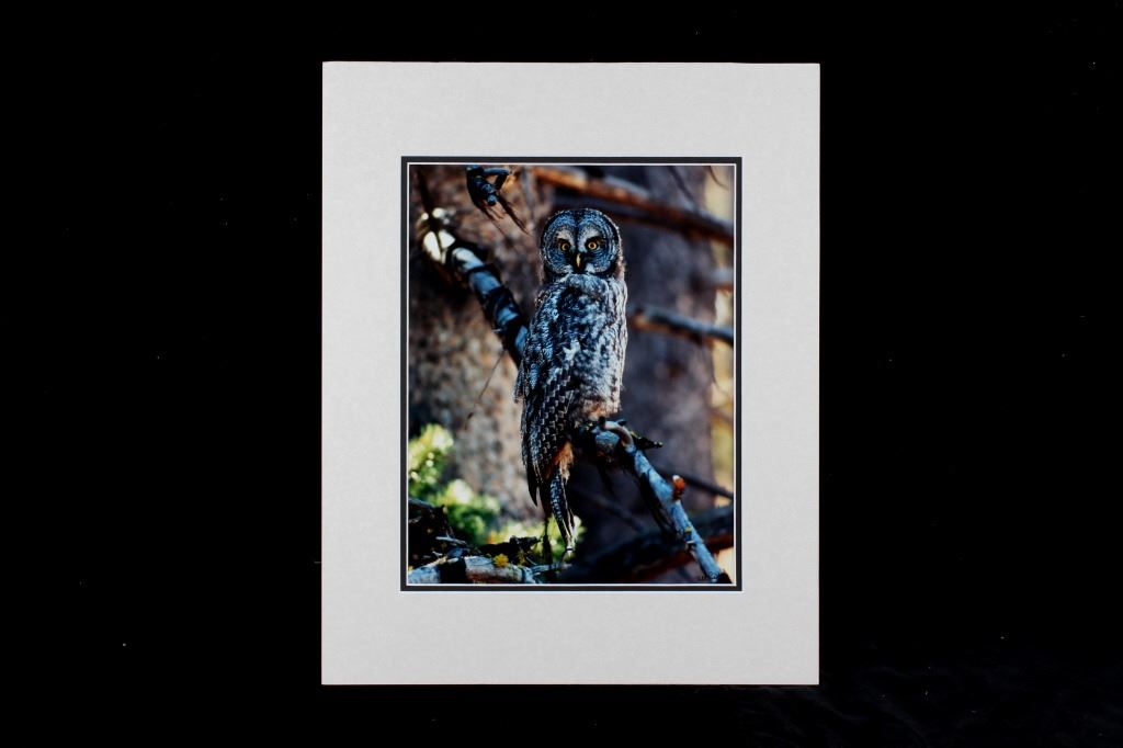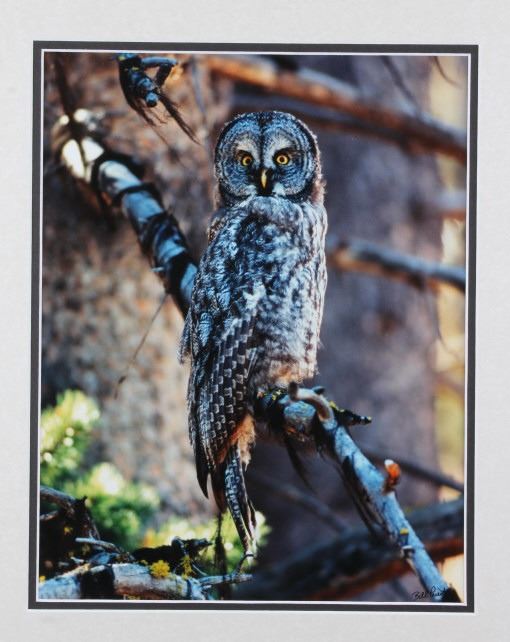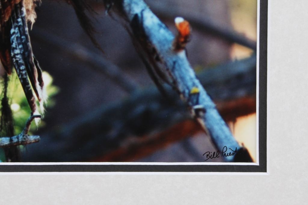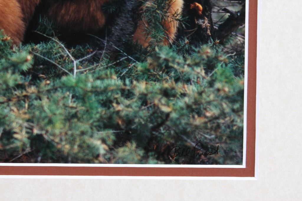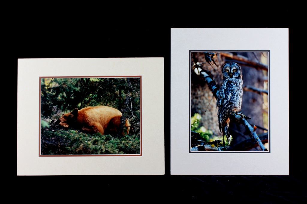 For your consideration is this pair of Priest, Bill Photography matte photographs. The matte photographs show professional construction with a speckled off white border. The first photograph is a lazy scene of a brown bear slumbering on a fallen down tree truck; the second photograph is of a wise owl perched on a twig. The condition of this pair of matte photographs is good, with no obvious signs of damage. The pair is shown inside a protective sleeve. The measurements of these matted photographs are 20" x 16" and the visible art measures 10 1/2" x 10 1/4".