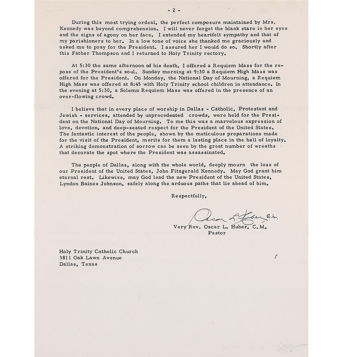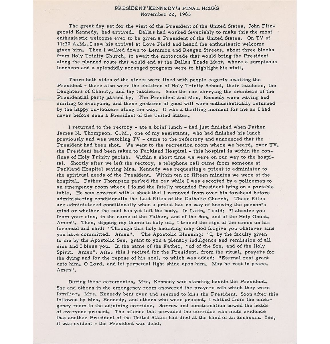 Souvenir typescript entitled “President Kennedy’s Final Hours,” two pages, 8.5 x 11, signed at the conclusion in black ink, “Oscar L. Huber, C. M.” In part: “He was covered with a sheet that I removed from his forehead before administering conditionally the Last Rites of the Catholic Church. These rights are administered conditionally when a priest has no way of knowing the person’s mind or whether the soul has yet left the body…Yes it was evident—the President was dead.” In fine condition, with staple holes to the upper left corner. Accompanied by an unsigned postcard photo of Huber.