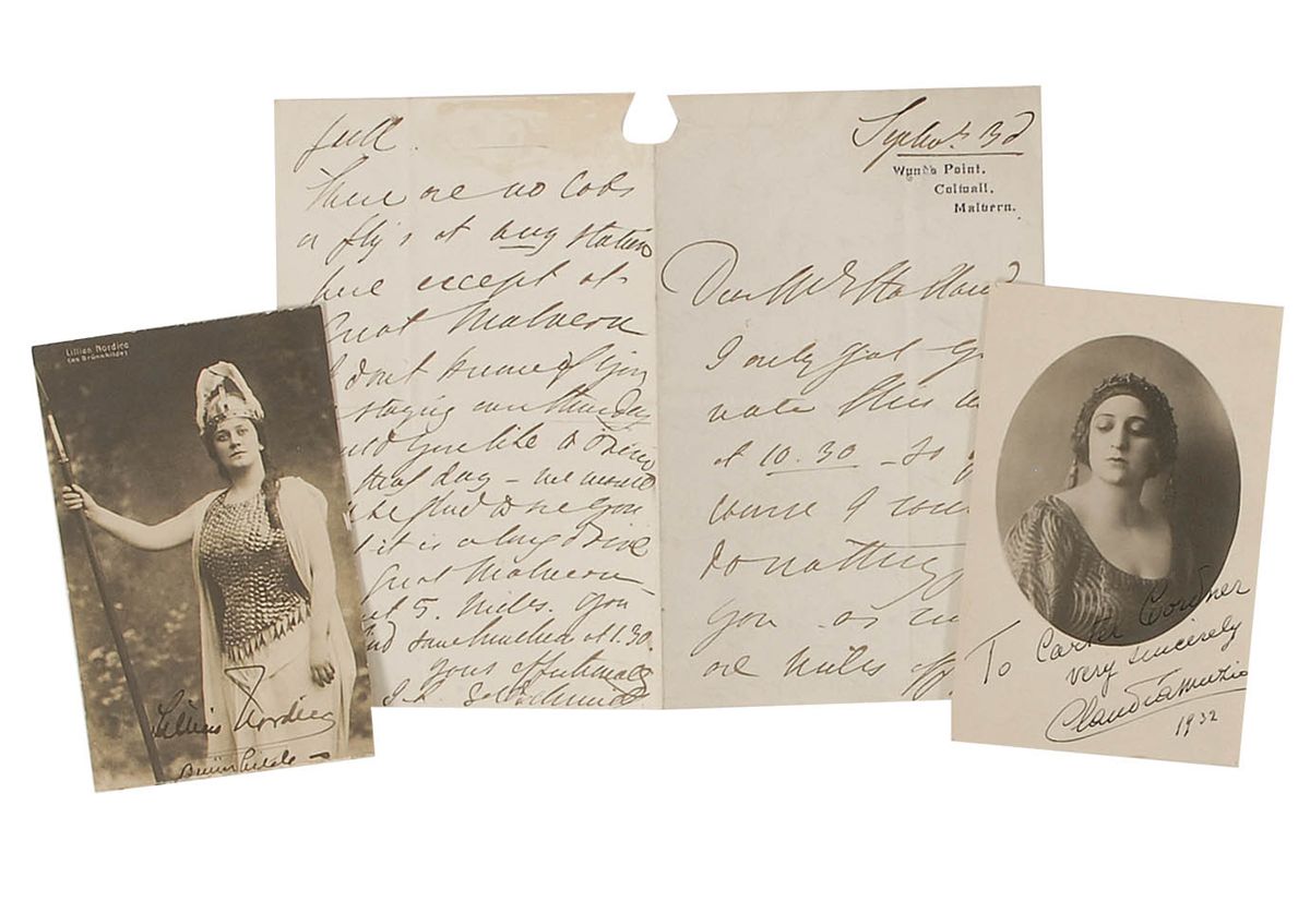 Three items: ALS, signed “J. L. Goldschmidt,” four pages on two adjoining sheets, 4.5 x 7, Wynd’s Point letterhead, September 3. A letter to a gentleman concerning her upcoming travel plans; a vintage 3.25 x 5.25 postcard photo of Claudia Muzio, signed and inscribed in fountain pen and dated 1932; and a vintage 3.25 x 5.25 postcard photo of Lillian Nordica as Brunnhilde, signed in fountain pen. Paper loss to top of hinge of letter and a bit of light silvering to photos, otherwise fine condition.