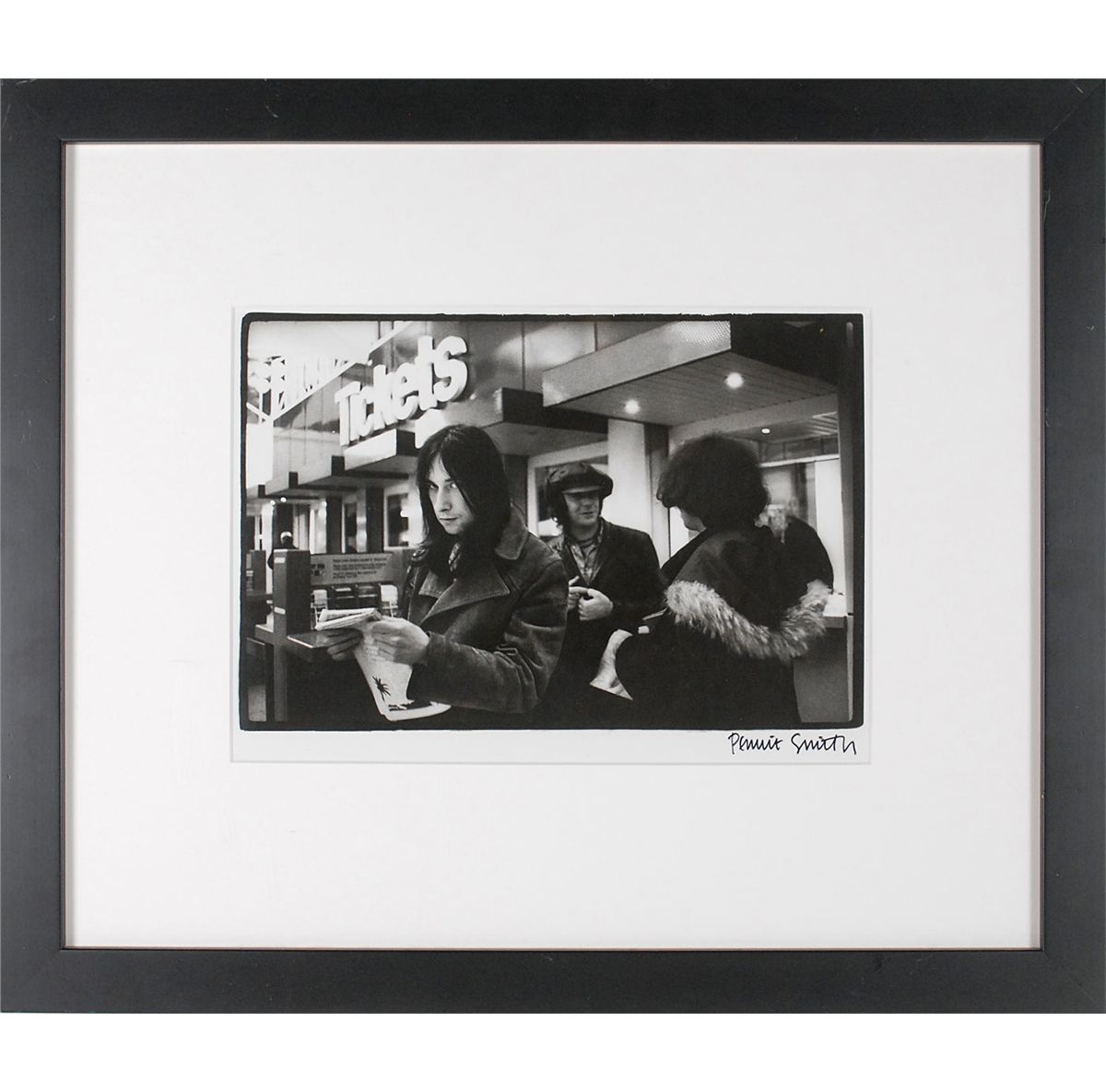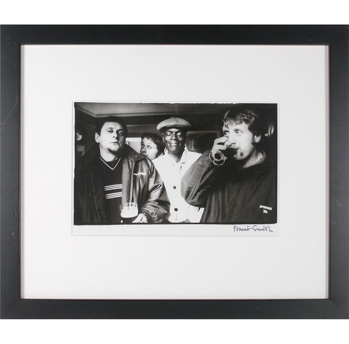 Nice 11 x 8 print of a Pennie Smith photo of Primal Scream’s Bobby Gillespie looking up from his newspaper as a couple of his band mates chat behind him, signed in the lower border in black ink by Smith. Framed to an overall size of 19.5 x 16.5. Also included is another 11 x 8 print of a Smith photo of a band enjoying a beer, signed in the lower border in black ink by Smith, and framed to an overall size of 19.5 x 16.5. In fine condition. Provenance: Gerry Harrington.