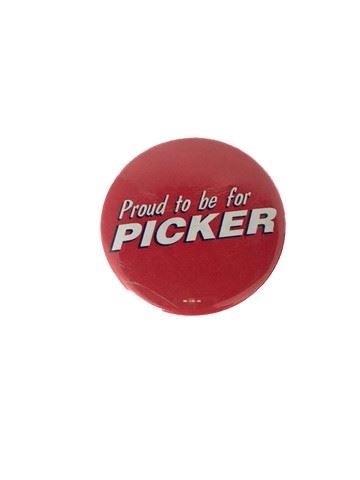 Primary Colors (1998) original "Proud To Be A Picker" pin worn by the cast and used in the campaign speech in the John Travolta film.Comes with a letter of provenance from David Defino who is an Academy Award winning effects artist and Emmy winning lighting technician. He was the foreman at Gene Young Effects and worked on many amazing, iconic movies and commercials as well as special government projects and private industry and museums. (1x1)