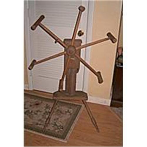 This primative yarn winder dates from 1870 to 1880 and is in very good condition with the exception of the top board that has split from lack of moisture... It is still all there and looks the way it should except for the crack. It is complete and if you knew what to do with it, it should work with no problem. It has three legs and six arms and they are all in very good shape... Order three of anything that we can ship in one container, pay with PayPal and shipping is FREE !