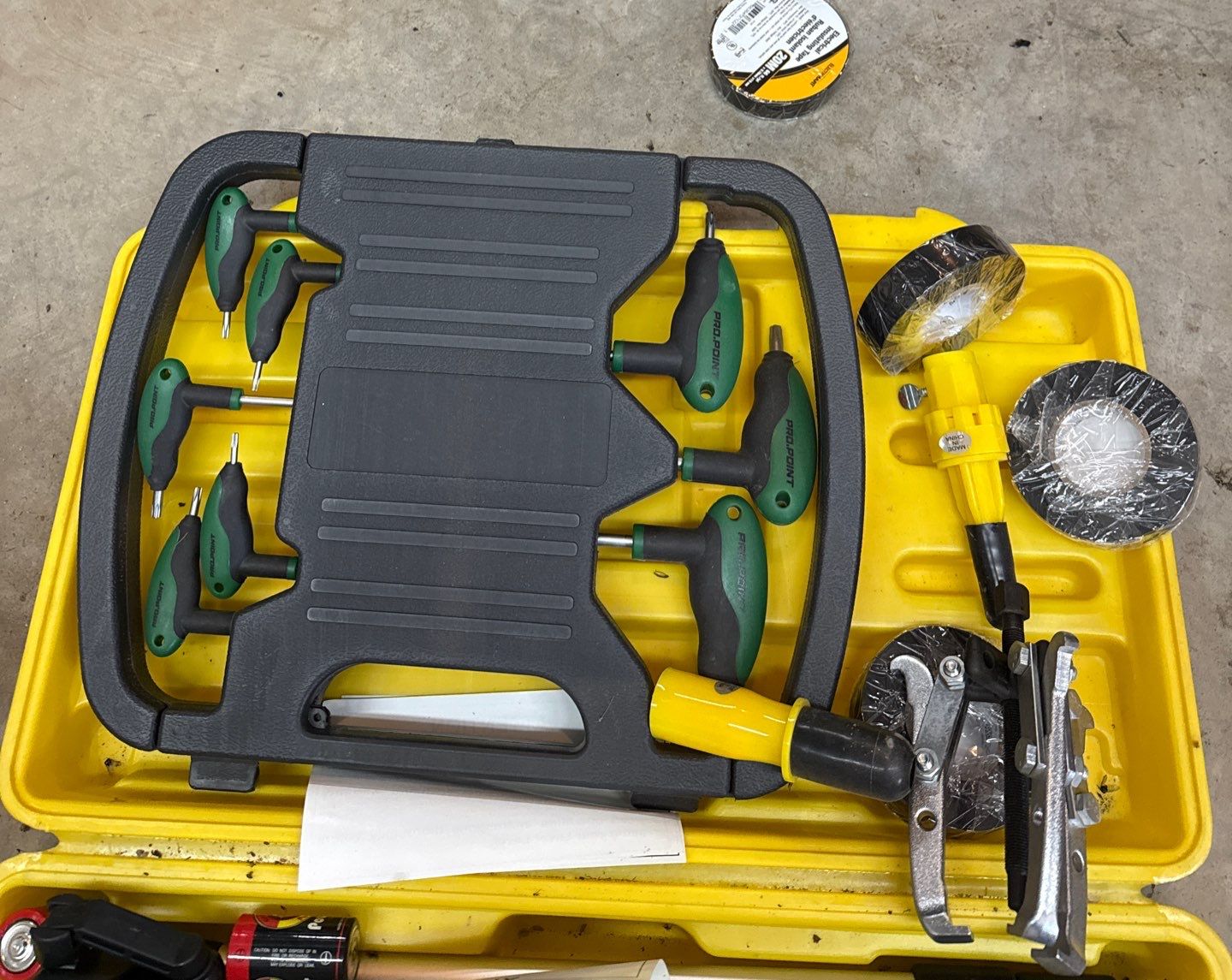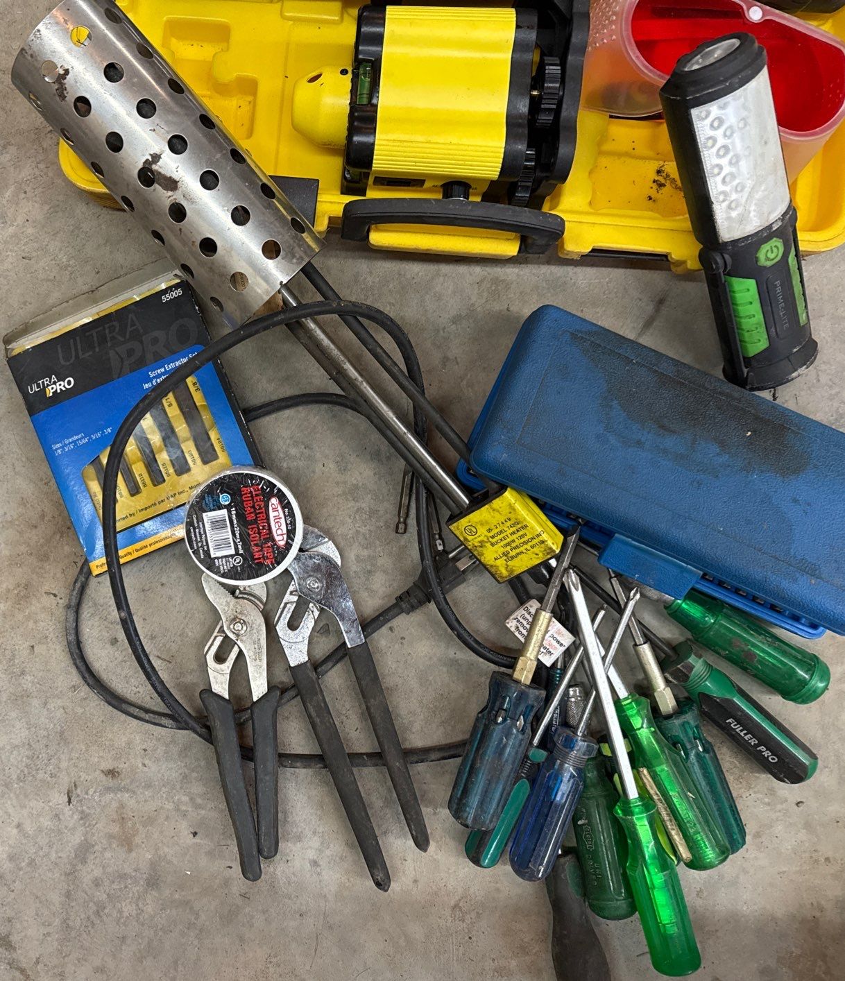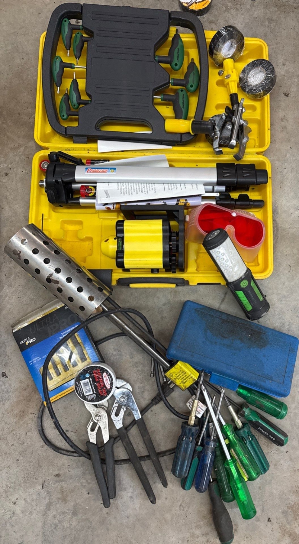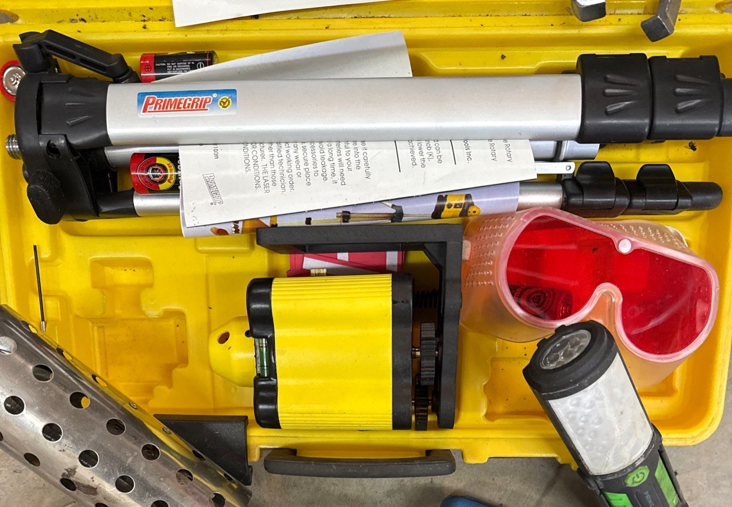 Prime Grip Laser Level Kit, Tiger Torch, Work Light, Screw Extractor Set, Pliers, Wrench