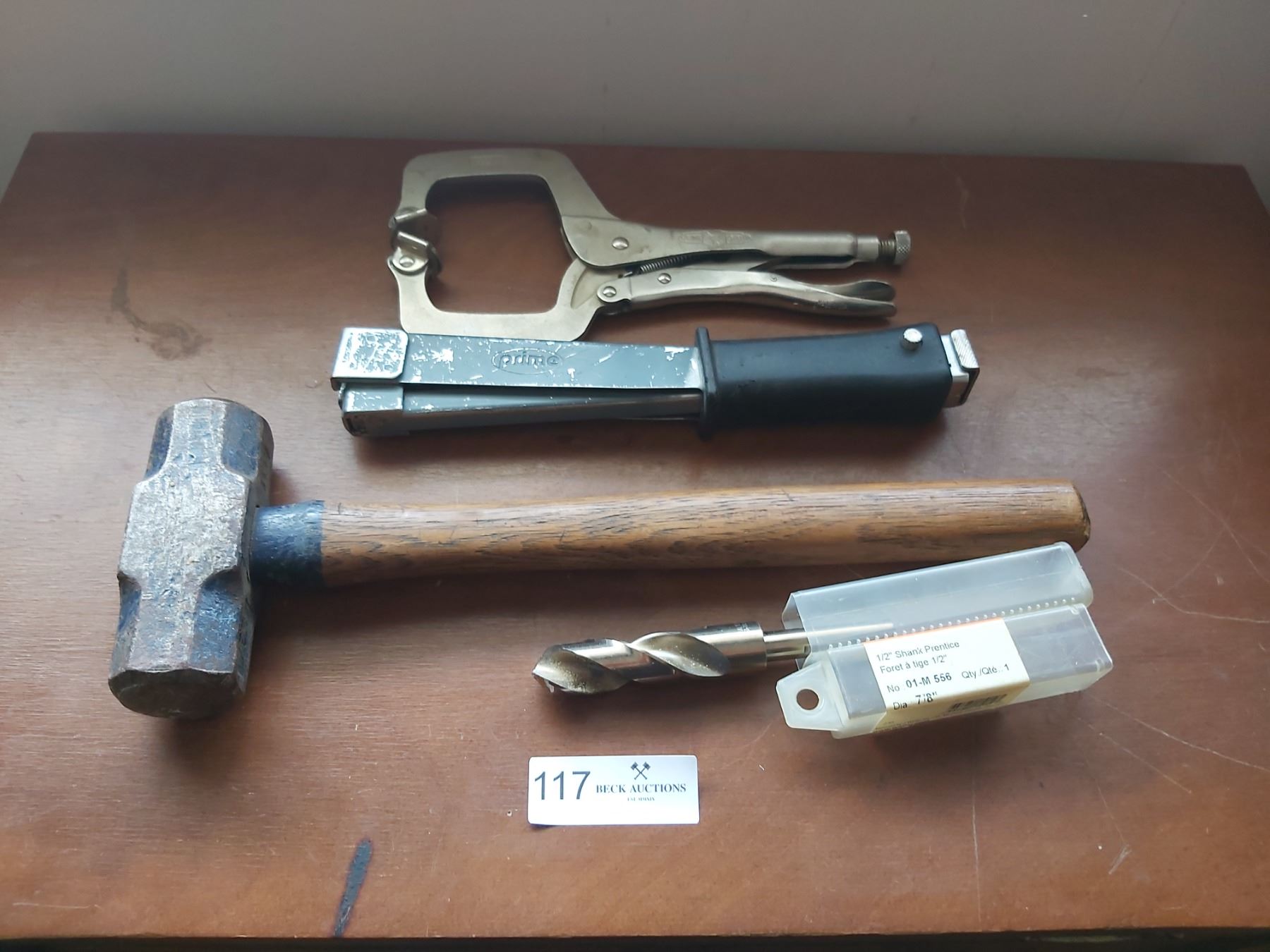 Prime Stapler, Sledgehammer (4 Pound) & 1/2  Shank Prentice Drill Bit With Vice Grip.