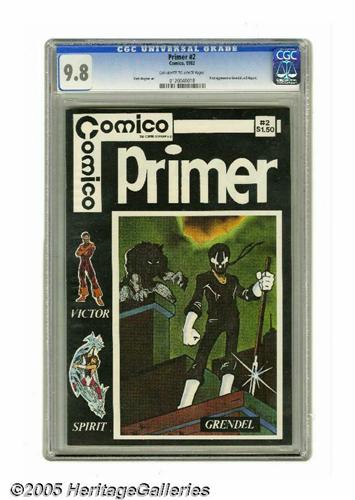 <B>Primer #2 (Comico, 1982) CGC NM/MT 9.8 Off-white pages.</B></I> First appearances of Grendel and Argent. Matt Wagner art. Overstreet 2005 NM- 9.2 value = $130. CGC census 2/05: 4 in 9.8, none higher. <I>From the collection of Chris Bell.</B></I>
