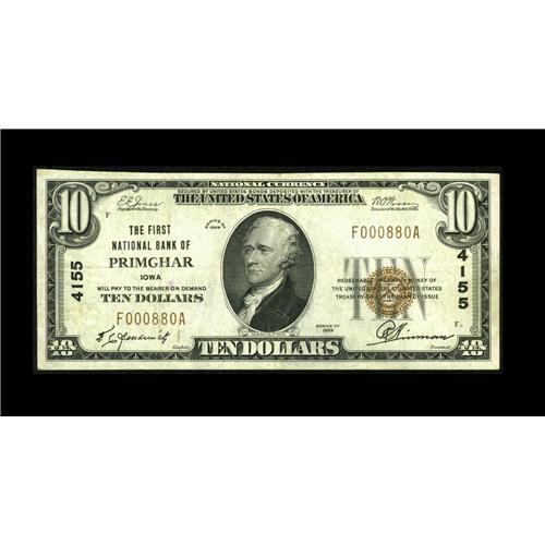 <B>Primghar, IA</B></I> - $10 1929 Ty. 1 <B>The First NB</B></I> Ch. # 4155<BR>While two banks were located here, this and the Farmers National Bank, this was the only one to survive long enough to issue the 1929 series. Our offering here is an exceptionally clean and crispy <B>Very Fine+</B></I> with an exceptional degree of eye appeal.