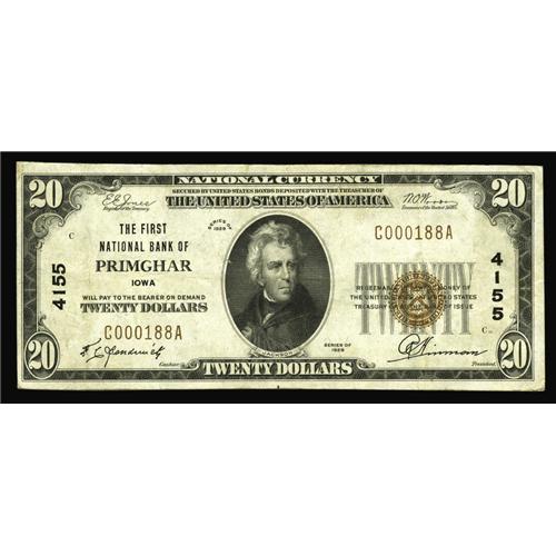 <B>Primghar, IA</B></I> - $20 1929 Ty. 1 <B>The First NB</B></I> Ch. # 4155<BR>Only moderate signs of circulation are noted on this original Iowa note. Right around a dozen small size notes are known on this bank. <B>Very Fine.</B></I>