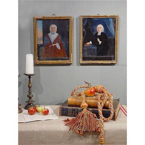 <table width="100%" border="0" cellspacing="0" cellpadding="4"><tr><td><em> RARE 18th C. Folk Art Portraits- Reverse painting on Glass with written history- CHARMING Country PRIMITIVES! </em></td></tr><tr> <td width="100%"> A rare and unusual pair of 18th C. French portraits discovered in Southern France. Reverse painted on glass the portraits depict a protestant minister and his wife, each rendered in a wonderfully naïve Folk Art style. The paintings have a compelling charm; fine detail displays the fashions of the day, the woman in lace, bonnet and shawl holding a fan. To her right, a glimpse out a window upon a landscape of mountains and a lake with two fishermen in a canoe. The Minister is shown in official robes, his hand on a red bible, Indigo blue drapes highlight his black garb and white collar and cuffs.