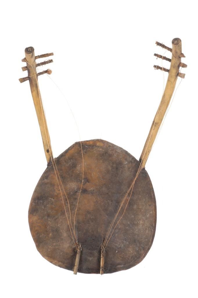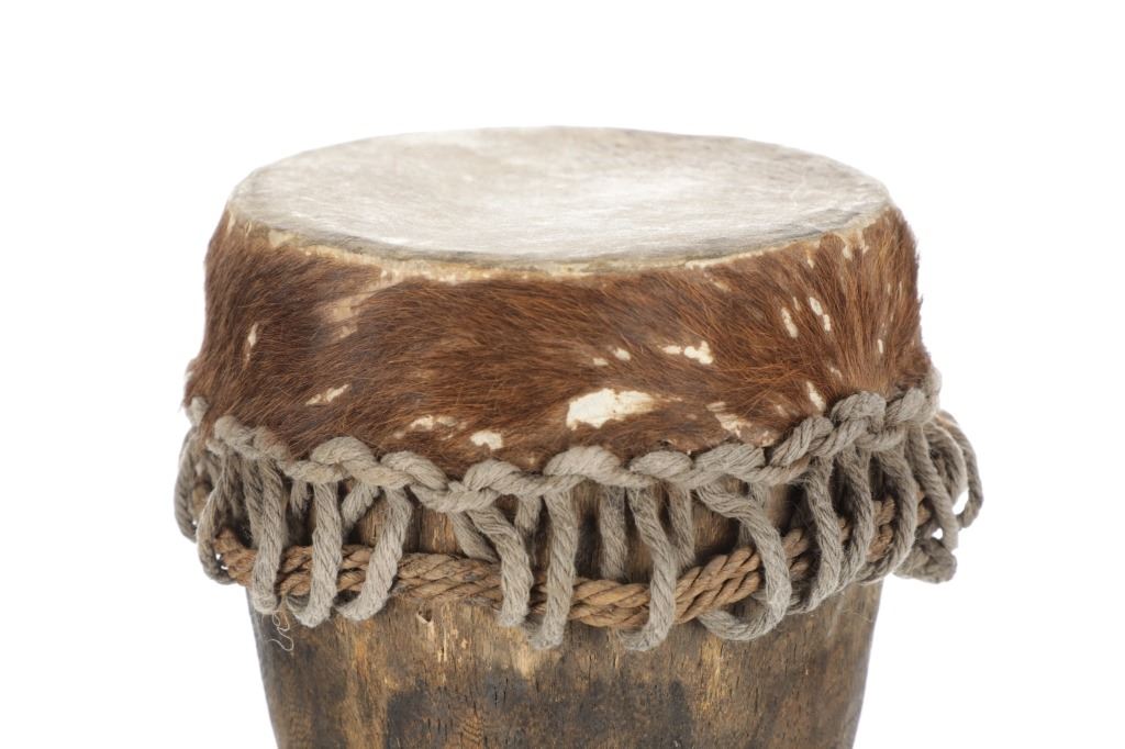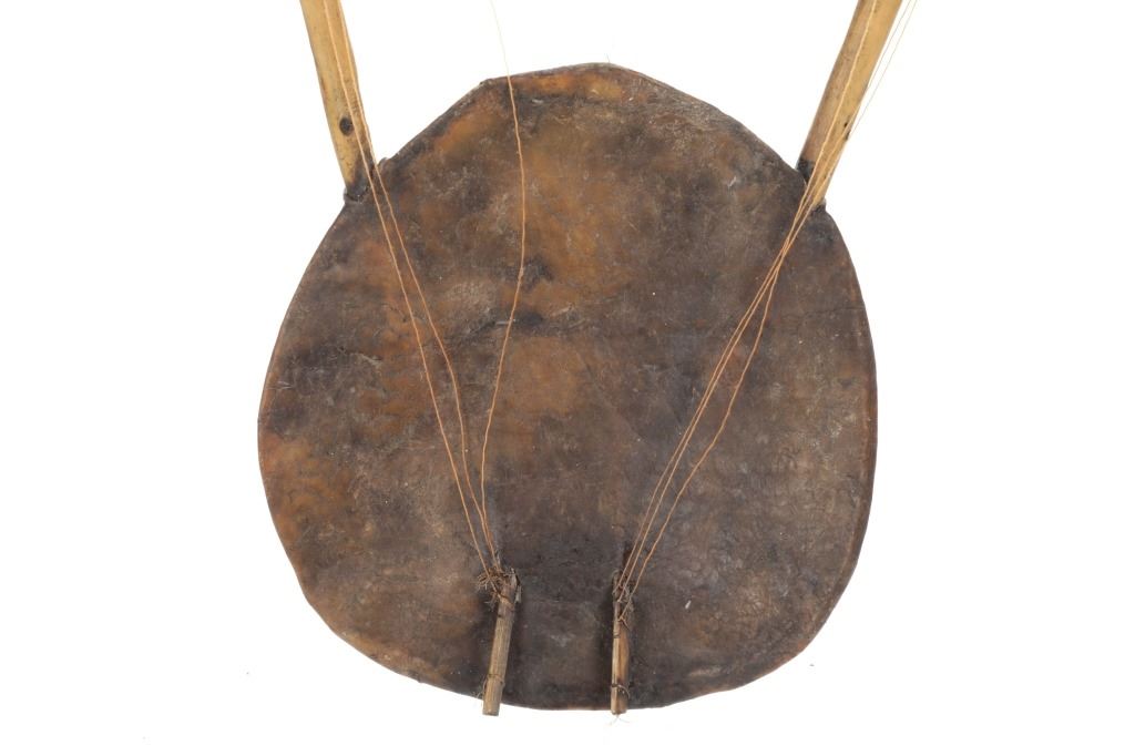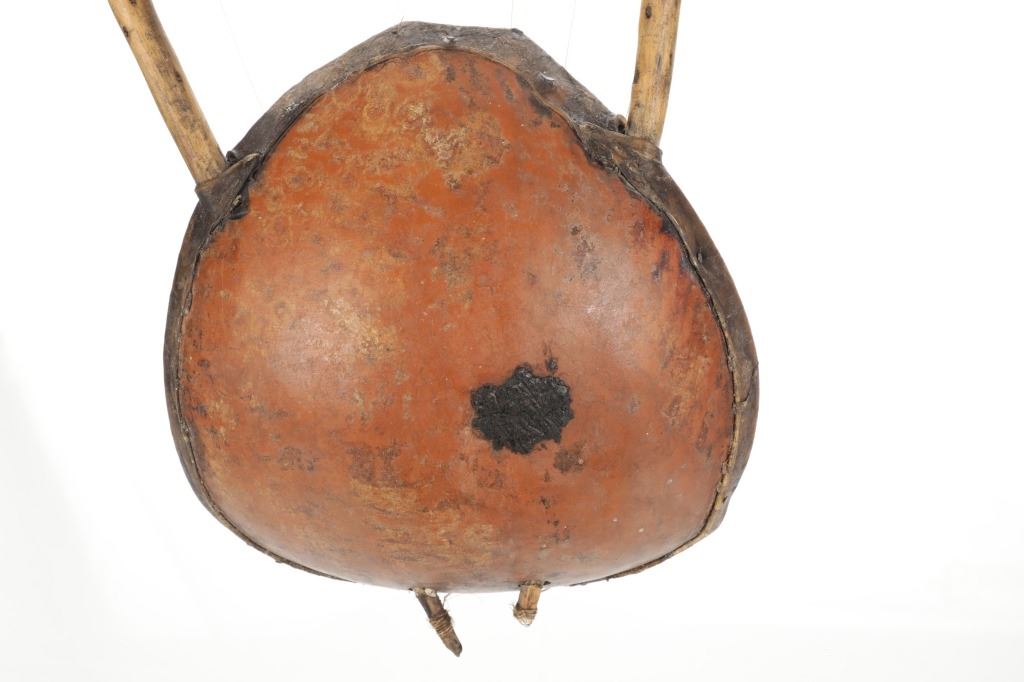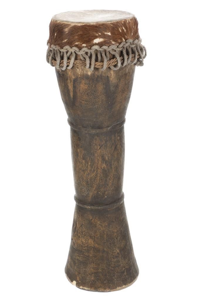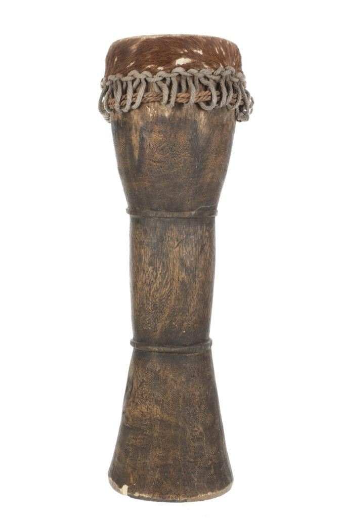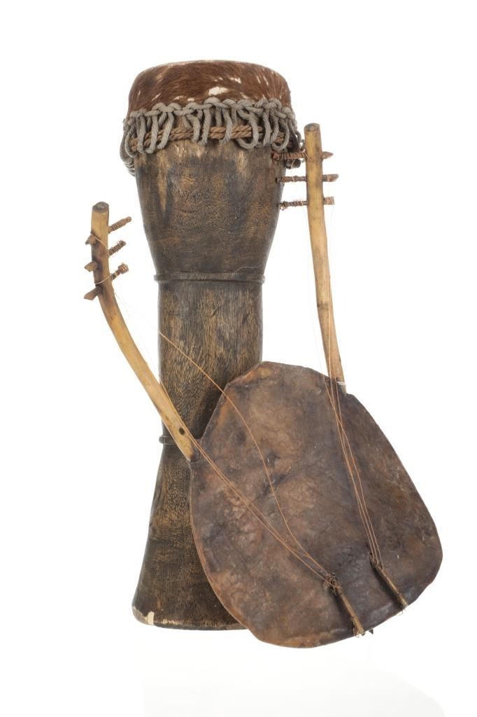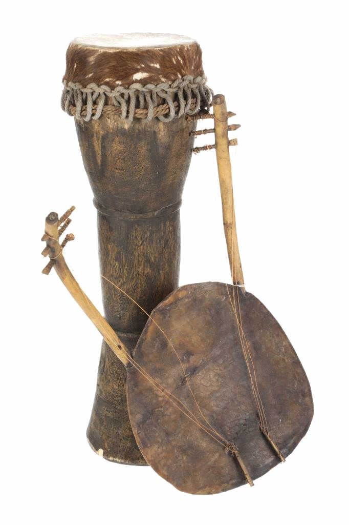 For your bidding pleasure in this lot are two primitive African musical instruments. The first is a Djembe. A Djembe is a goblet-shaped drum, covered with skin and tuned by ropes; the djembe originates from West Africa and has been traced to the Numu. The musical instrument spread across the west coast of Africa with the rise of the Mali Empire (1230 AD). This drum is 22" tall and 6" across the "head". On the bottom of the drum is some damage that was repaired. The next instrument is a Kora. This stringed instrument is made from a calabash gourd and covered in skin. A Kora is usually strummed in accompaniment to storytelling, or singing, and has been in use for over 5000 years. It is extensively used in western and eastern Africa. There are several versions of it across Africa, like the lute, ngoni, gonje, and more. The belly is approximately 10 1/2" x 10 1/2"; the dual necks extend 10 1/2" out from the belly. On the back of the calabash is a patch made of pitch. These instruments are in fair to poor display condition.